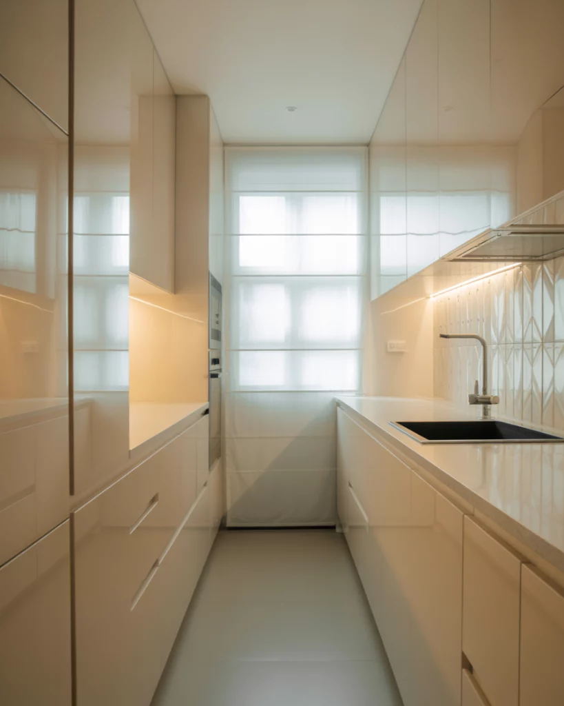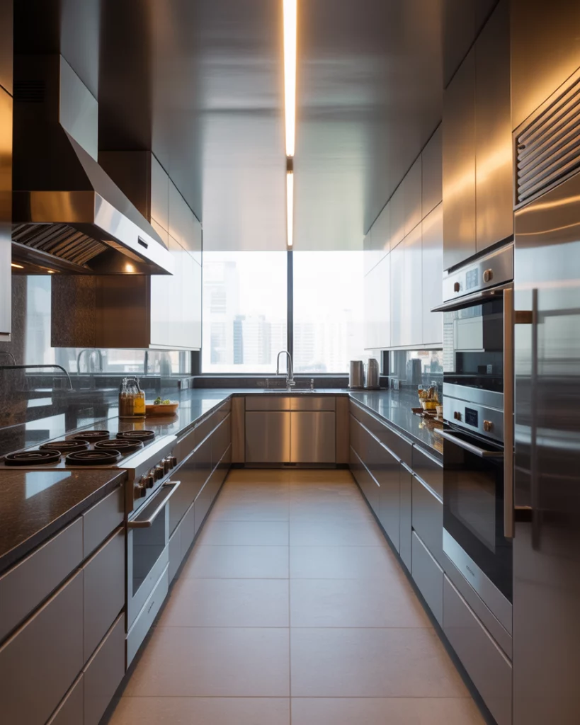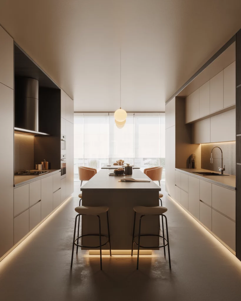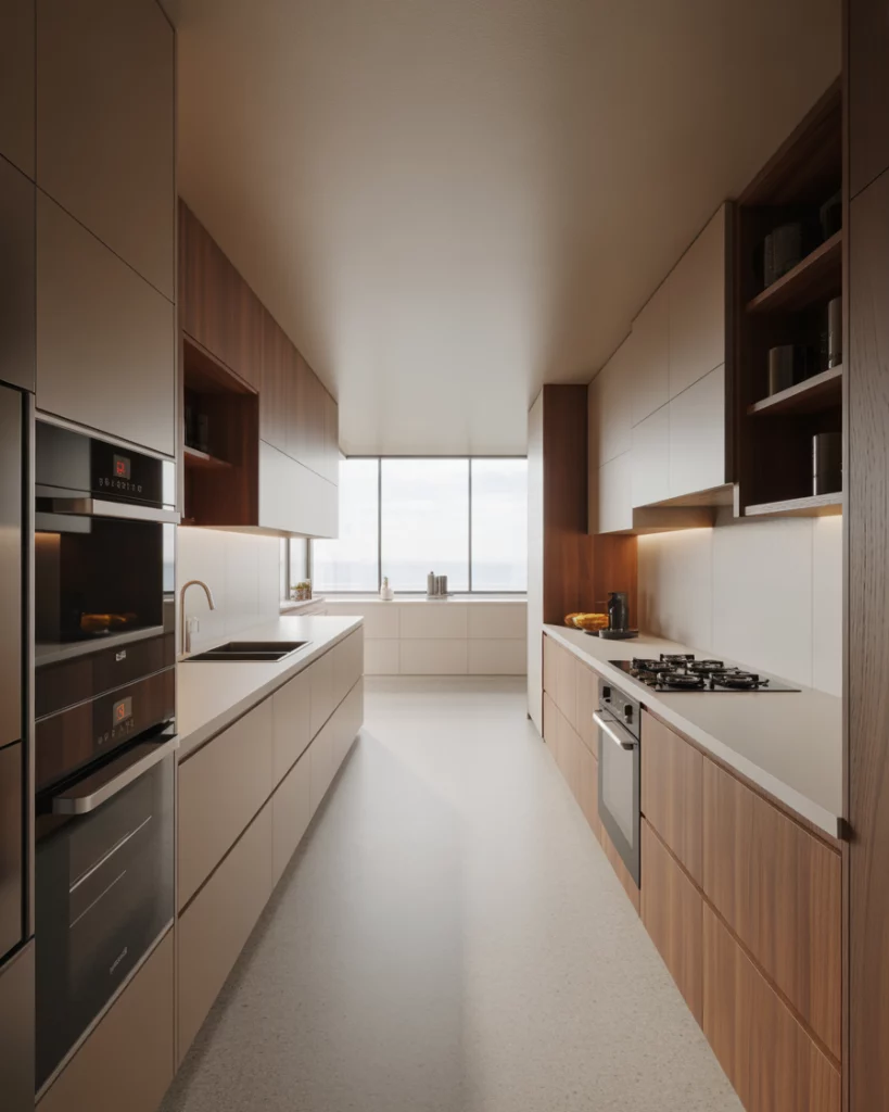 A double galley setup—cabinets on both sides—creates efficient zones for prep, cooking, and cleanup. Thoughtfully planned cabinets keep essentials accessible, ideal for compact cooking enthusiasts. This structure works well in condos or accessory dwelling units where maximizing space matters. I once tested this layout in my own rental and managed to store everything from mixers to meal-prep containers with ease.