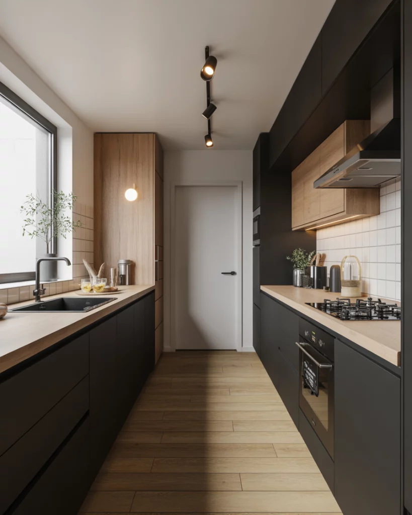 Updating hardware with black finishes is a fast makeover that adds contrast without a full renovation. Paired with light woods or white paint, black handles and faucets give the galley a modern edge. This idea applies to nearly any home—from apartments to older cottages.