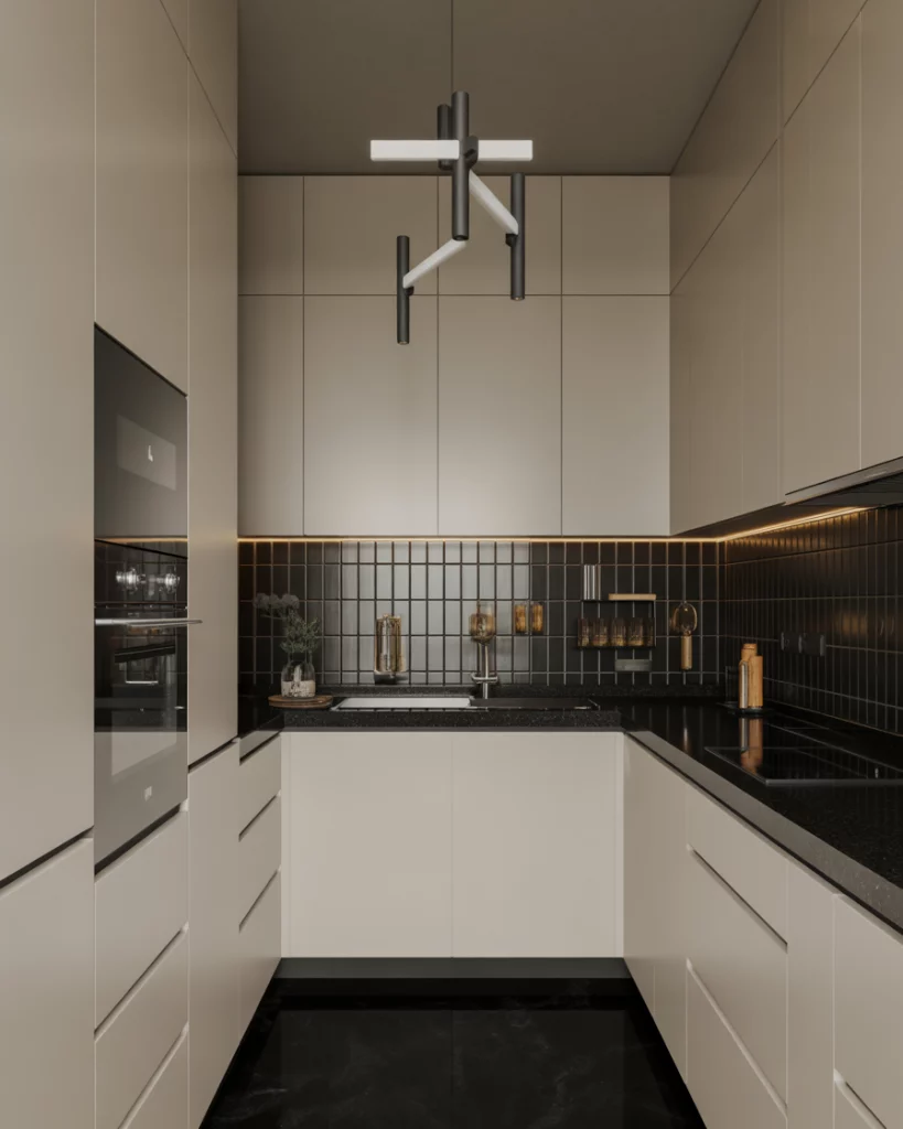 A minimalist palette using black and white strikes a crisp balance in modern galleys. This design feels clean, airy, and timeless—ideal for city apartments with limited space. Keeping lines simple and using hidden storage helps maintain a serene atmosphere that makes cooking feel almost meditative.