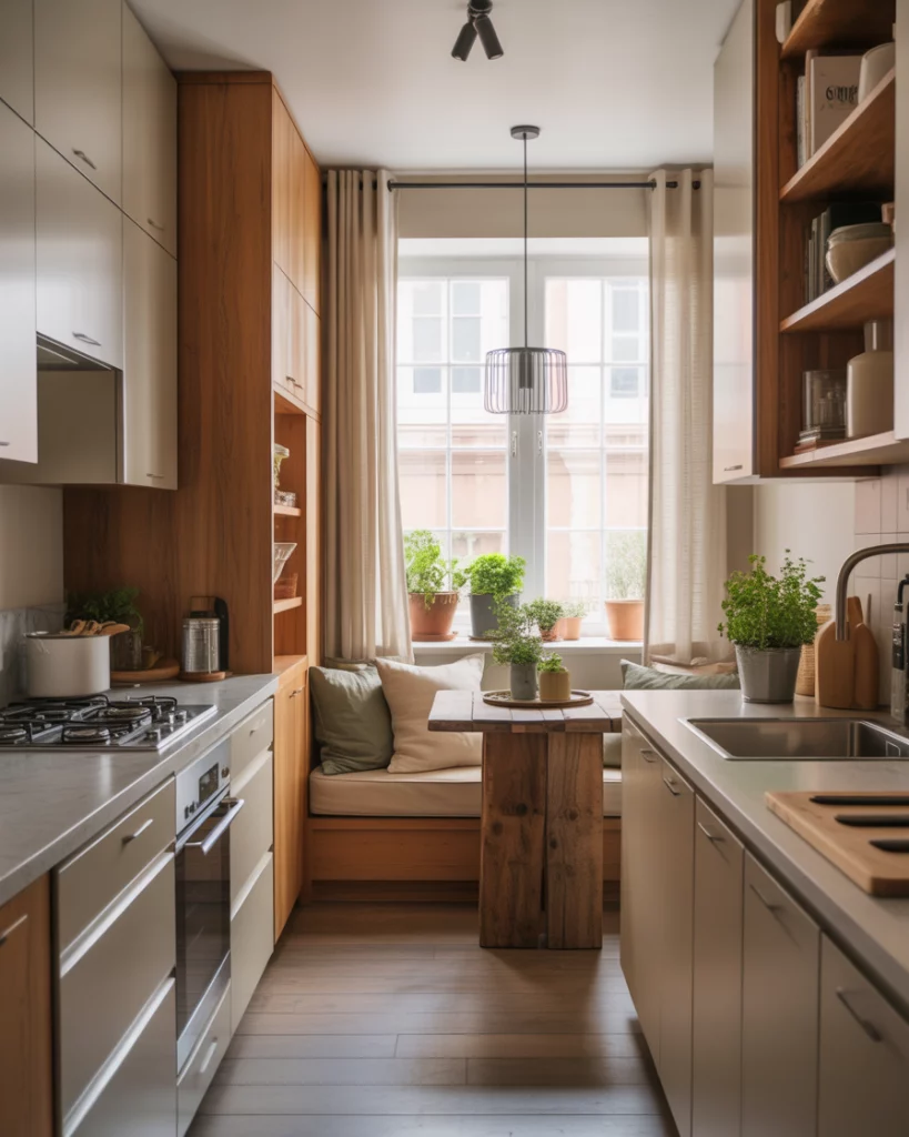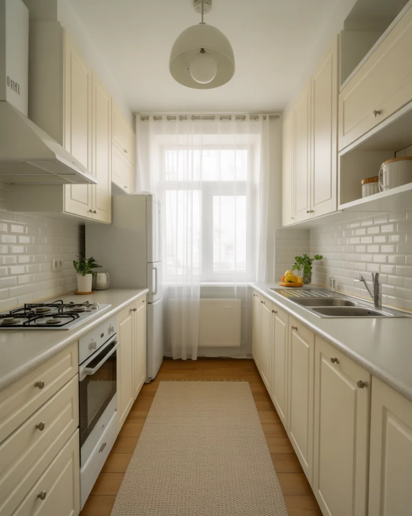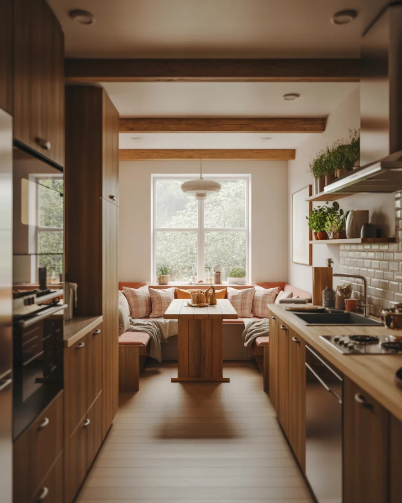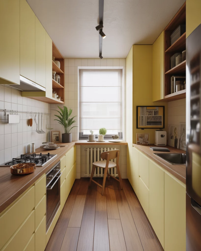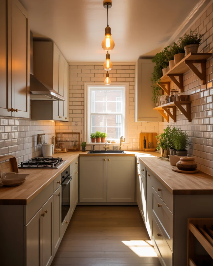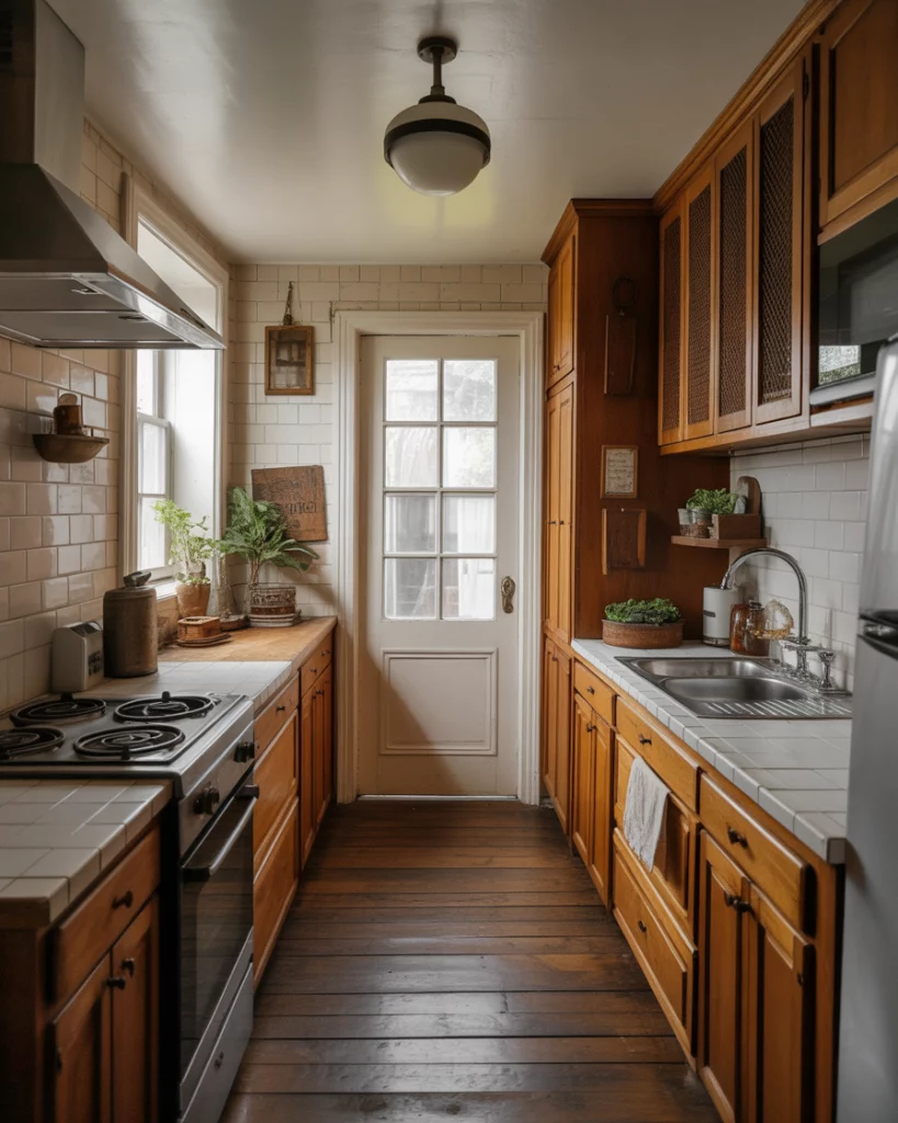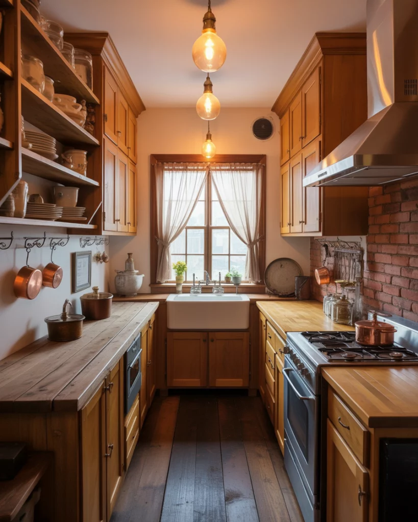 Bringing cottage warmth into a galley adds charm through wood textures, soft fabrics, and vintage-style lighting. This look suits older homes where character matters as much as function. Pairing simple cabinets with warm tones creates a nostalgic feel that’s perfect for small families or anyone craving coziness in a narrow space.