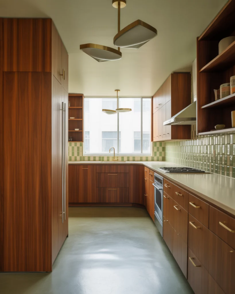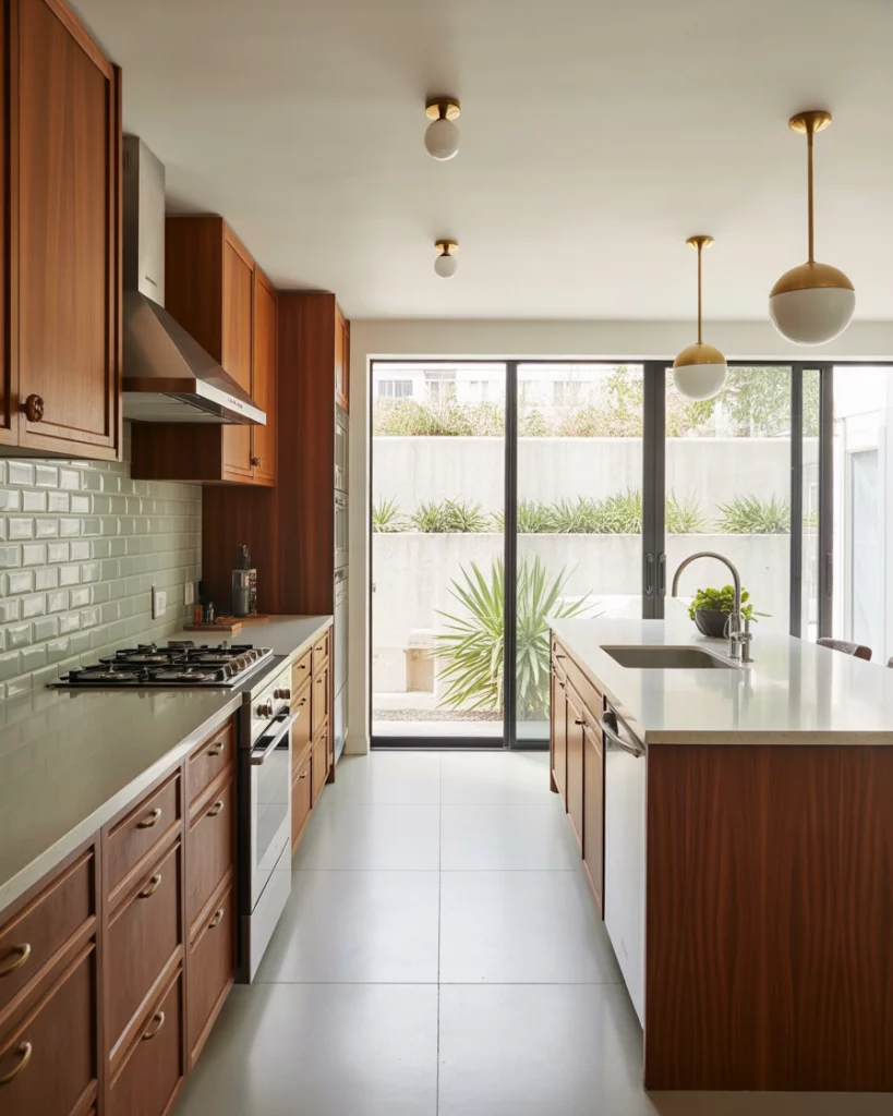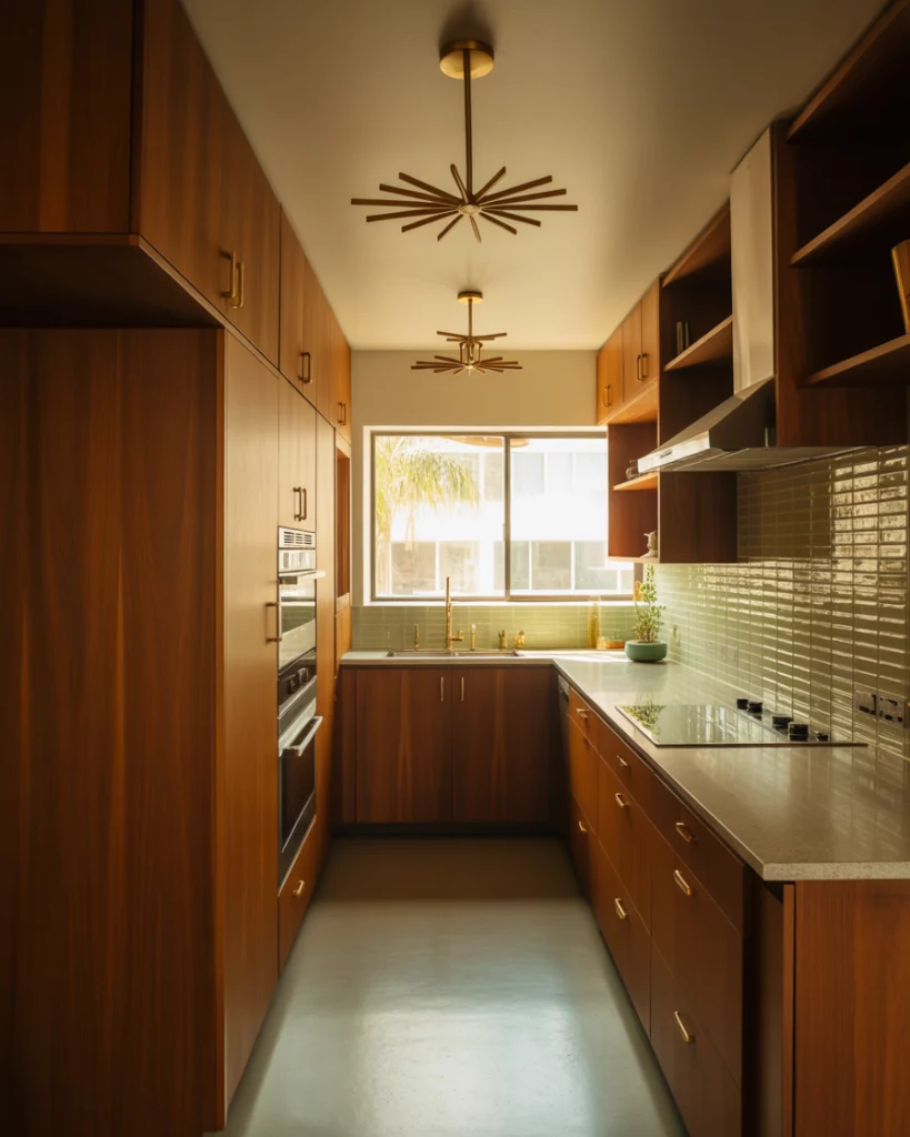 A mid-century approach brings clean lines, tapered legs, and warm wood into the galley format. Retro colors like soft orange or muted teal pair beautifully with today’s sleek floor plans. This approach works especially well in older suburban homes where the original architecture already hints at mid-century charm.