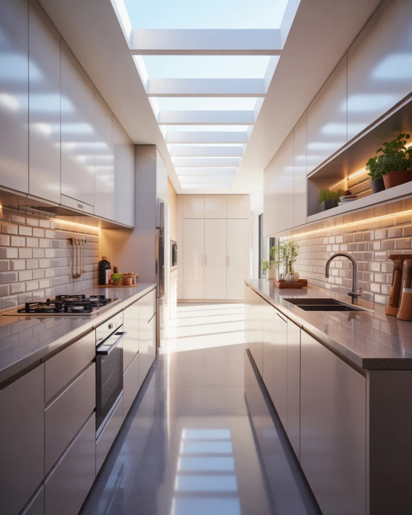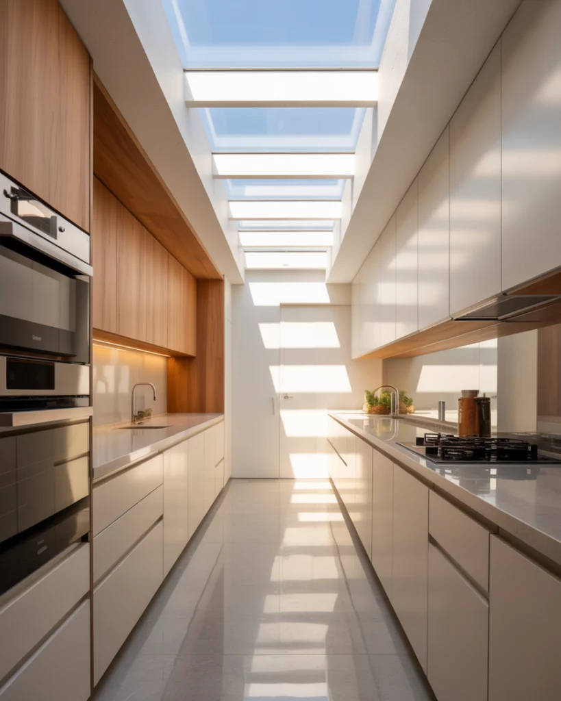 Creative remodel ideas often include skylights, especially when natural lighting is limited. A skylight brightens the central corridor and makes a long galley feel taller and more inviting. This upgrade suits single-story homes or attic conversions where overhead access is manageable.