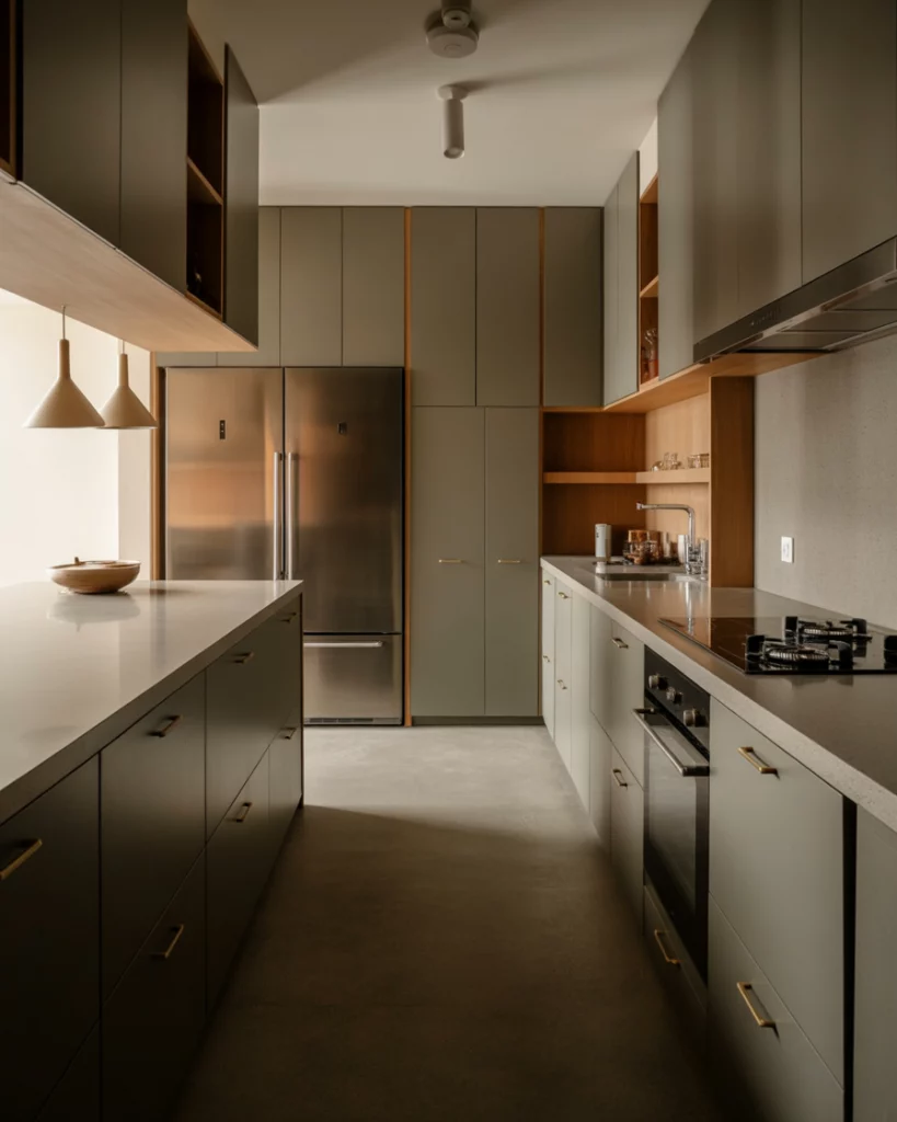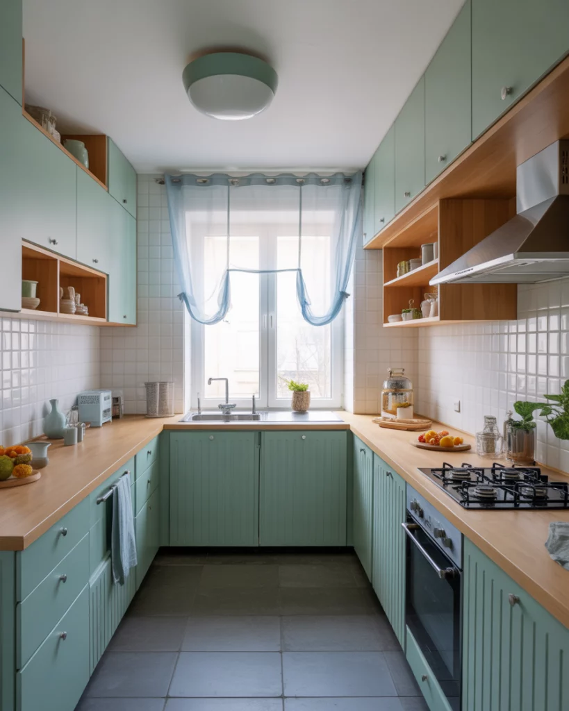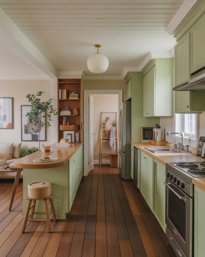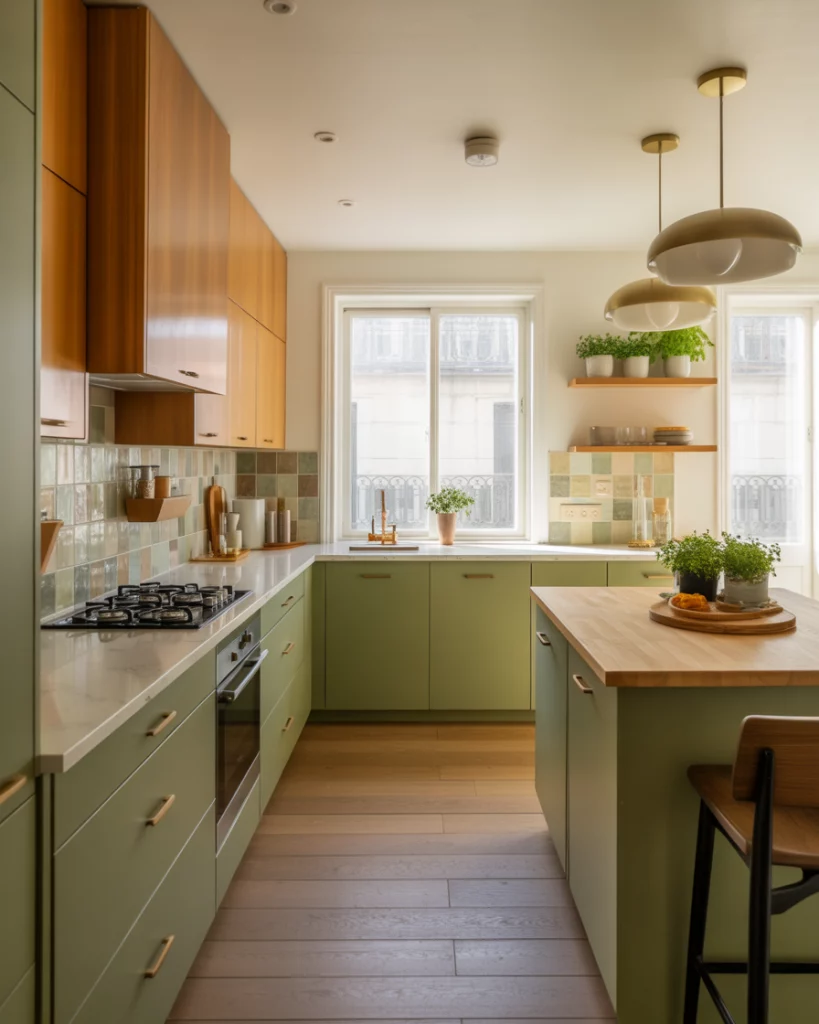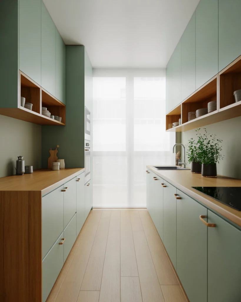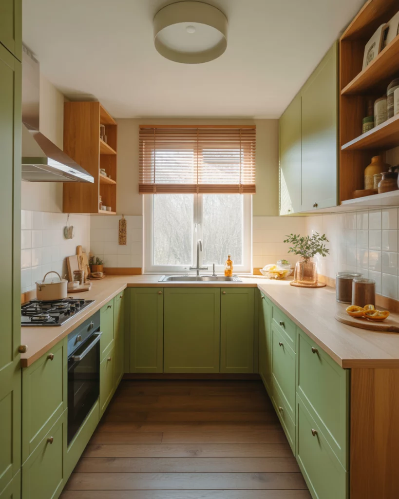 A green color story injects life into the galley without overwhelming it. Whether it’s paint, tile, or décor, green pairs beautifully with natural woods, adding grounded charm to any renovation. Mid-size homes and bungalows often benefit from these tones, especially when balancing modern lines with organic warmth.
