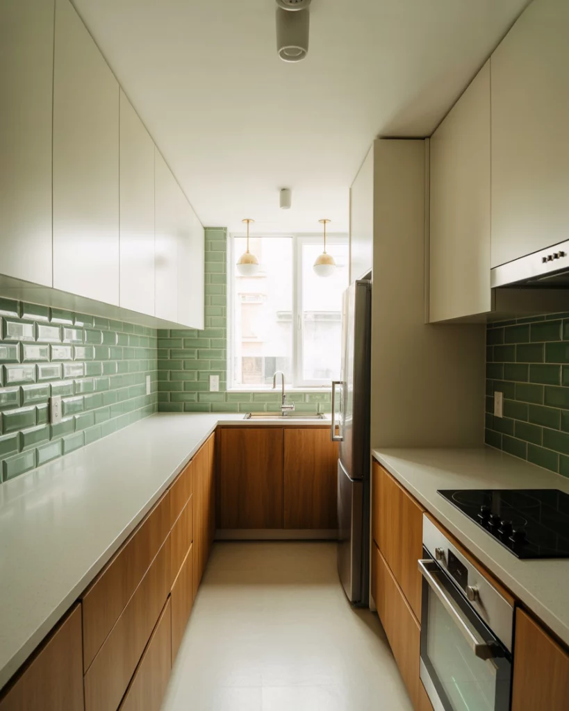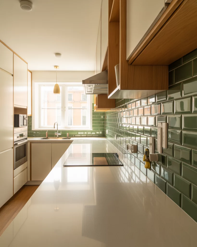A green tile backsplash instantly energizes a galley kitchen, giving life to tight spaces. It pairs well with natural wood, stainless steel, or white cabinets. Many designers point out that green feels timeless yet fresh, making it a favorite in 2026 renovation trends.
