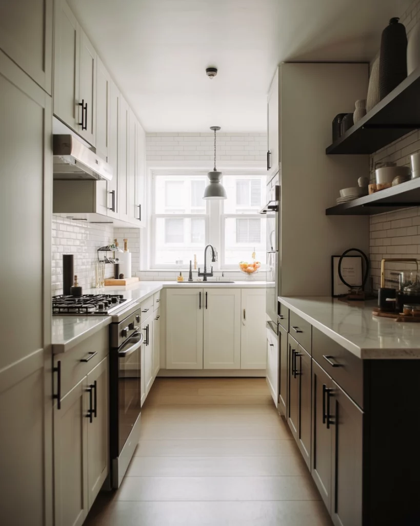 A white palette is a timeless trick for narrow kitchens, bouncing light and reducing visual clutter. Home bloggers like Chris Loves Julia swear by light tones for tight layouts. Whether you’re tackling a makeover or full renovation, white enhances clarity and calm—especially in homes lacking natural light.