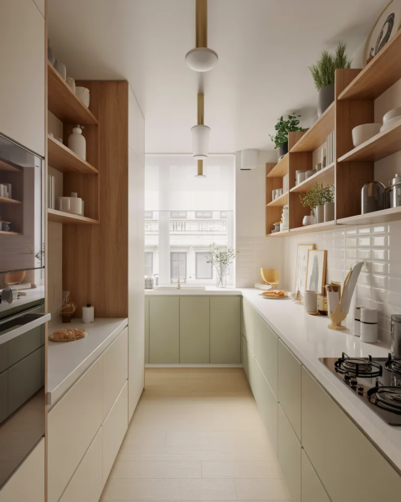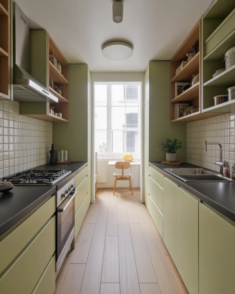 Replacing upper cabinets with open shelving creates an open feel in a narrow galley. This approach lightens visual weight and lets decorative pieces shine, blending practicality with personality. Homeowners who enjoy curated displays—like vintage mugs or handmade ceramics—find this design especially rewarding, and it works beautifully in both modern apartments and older homes.