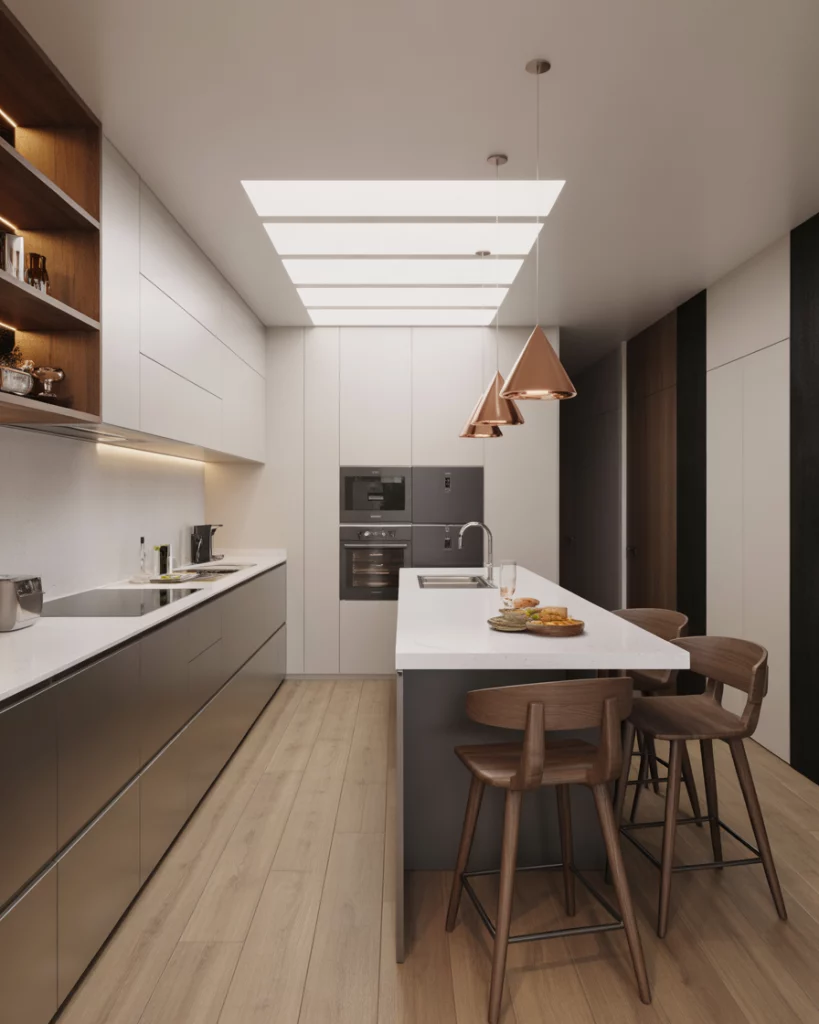 If space permits, a slim extension with island seating turns the galley into a social hub. These ideas with an island are perfect for homeowners who love entertaining but want to keep the efficient workflow of a classic galley. A small breakfast bar makes everyday meals feel casual and inviting.