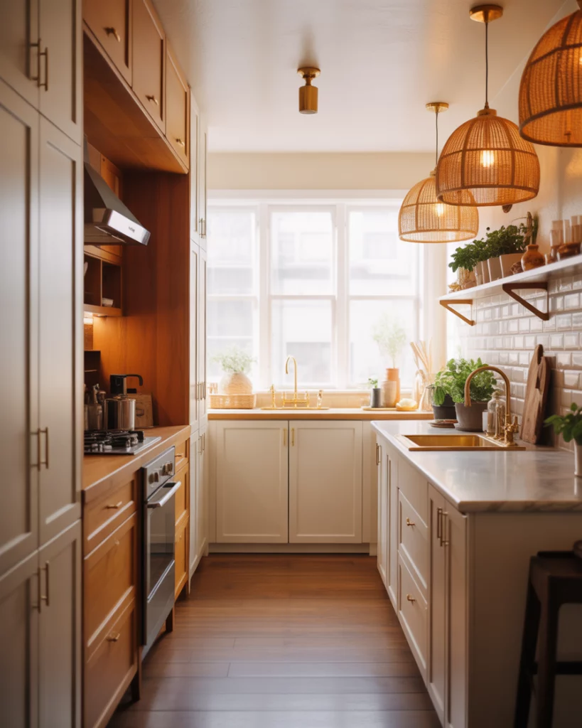 Soft lighting inspired by cottage style—like warm pendants or woven shades—brings comfort to the linear galley format. These choices soften sharp lines and give a welcoming feel to everyday cooking. This makeover works well for homeowners craving charm without major construction, blending vintage and modern effortlessly.