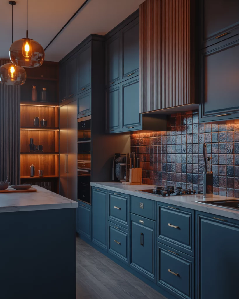 A bold blue hue brings depth to a galley kitchen, especially when paired with understated lighting and warm metal hardware. It elevates both modern and traditional floor plans. This choice works well for homeowners craving personality without sacrificing functionality, adding richness to everyday routines.