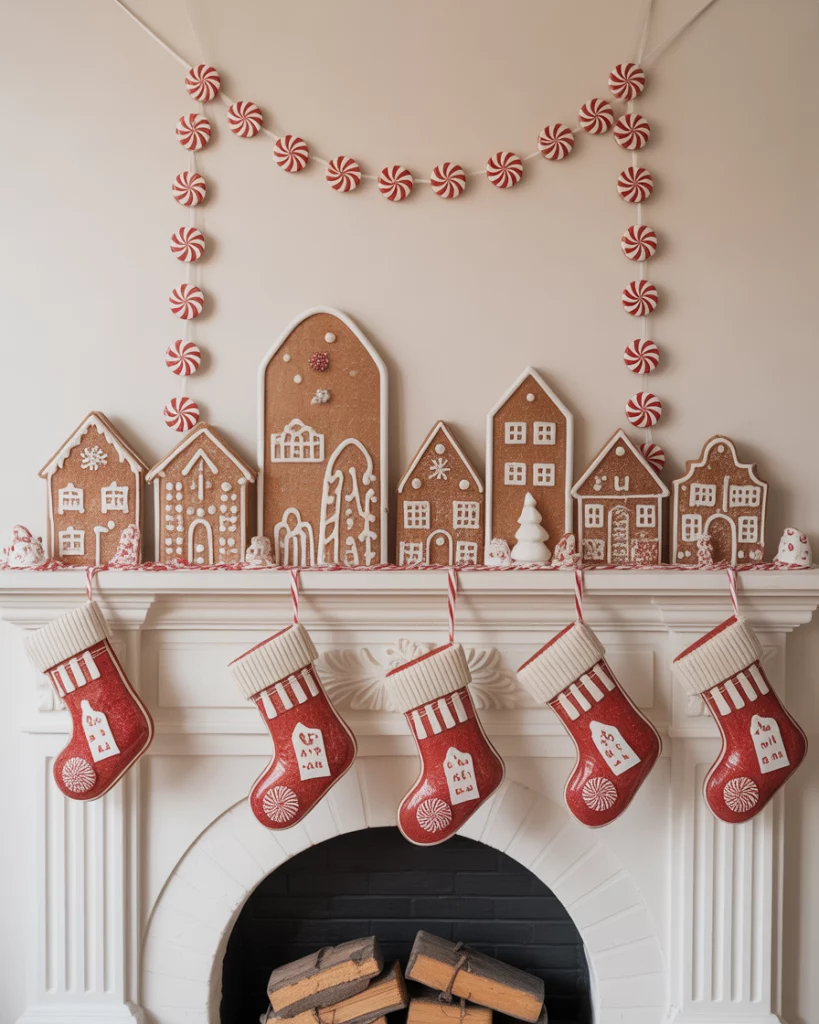 When you construct a gingerbread village on your fireplace mantle, it turns out to be the star of the room. Make houses out of cardboard or wood cutouts and paint them in faux icing or white paint. Insert string lights in the background. This is very effective in rooms with an old-fashioned theme, particularly when it is used with peppermint garlands and little gingerbread men at the doorsteps. The coziness of the hearth makes the holiday picture even more inviting–as if it were a village covered with sugar.