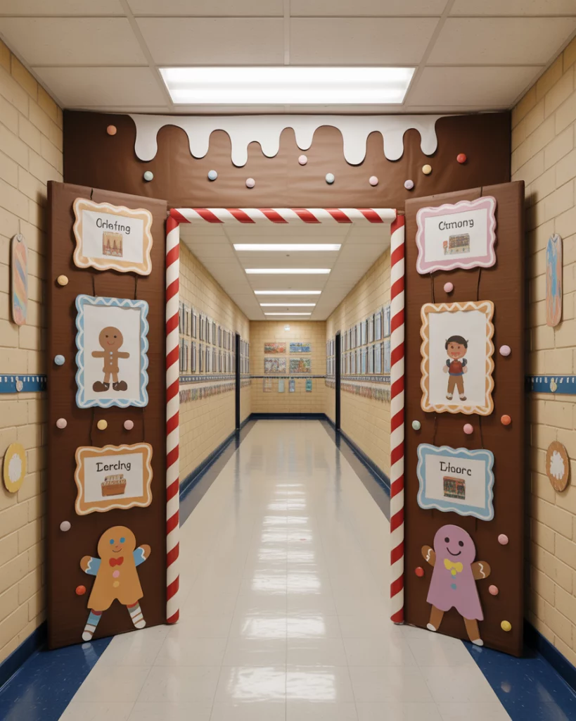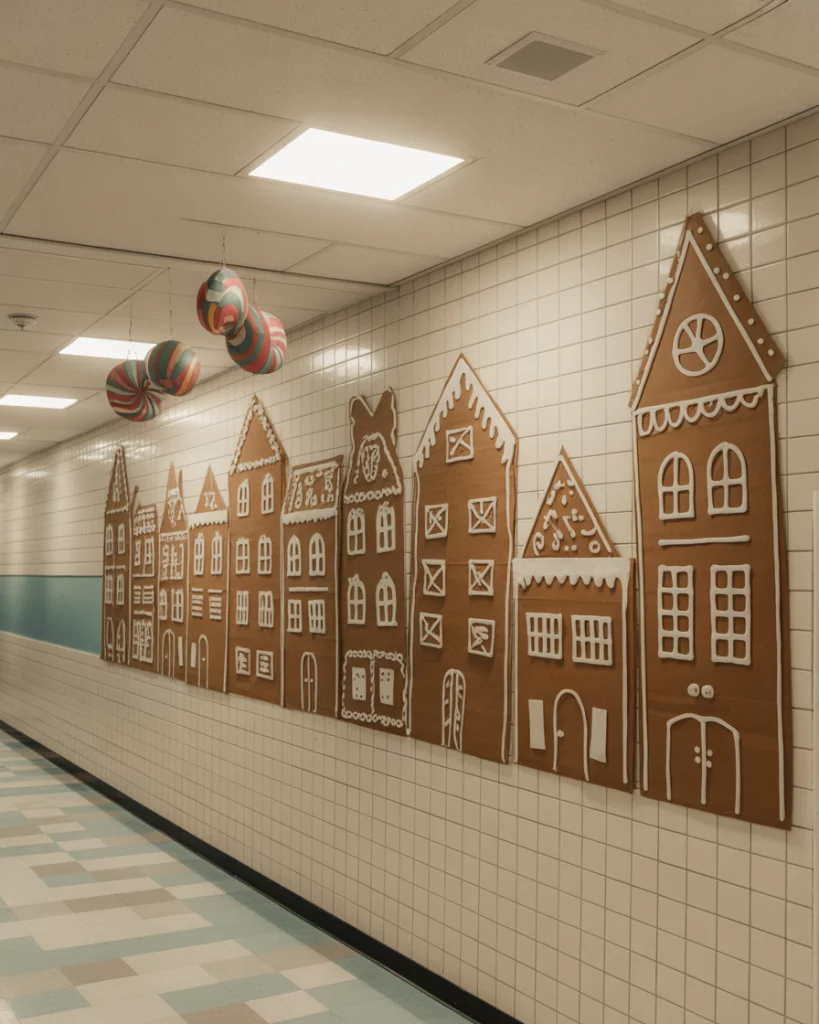 Design a gingerbread cityscape in a hallway at school with big cardboard panels as building fronts. Add paper windows, candy decoration, and name of classes on doors. It is a fun group DIY task that unites students to make a normal hall look like a street of sweets.