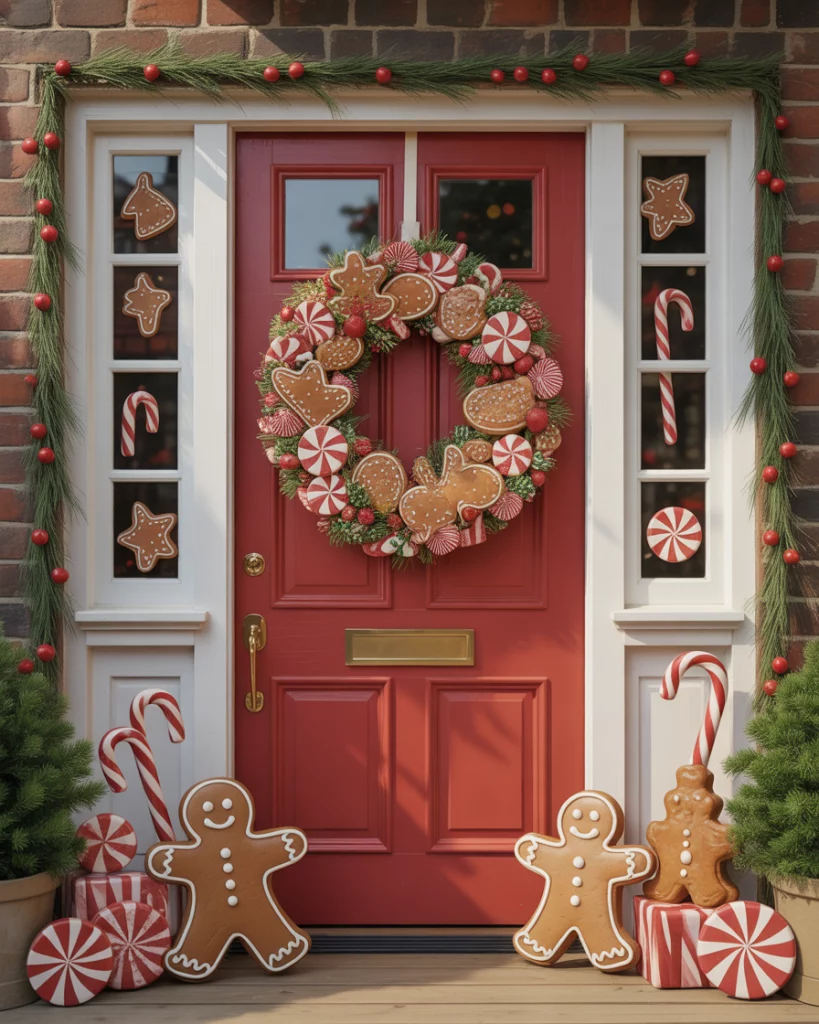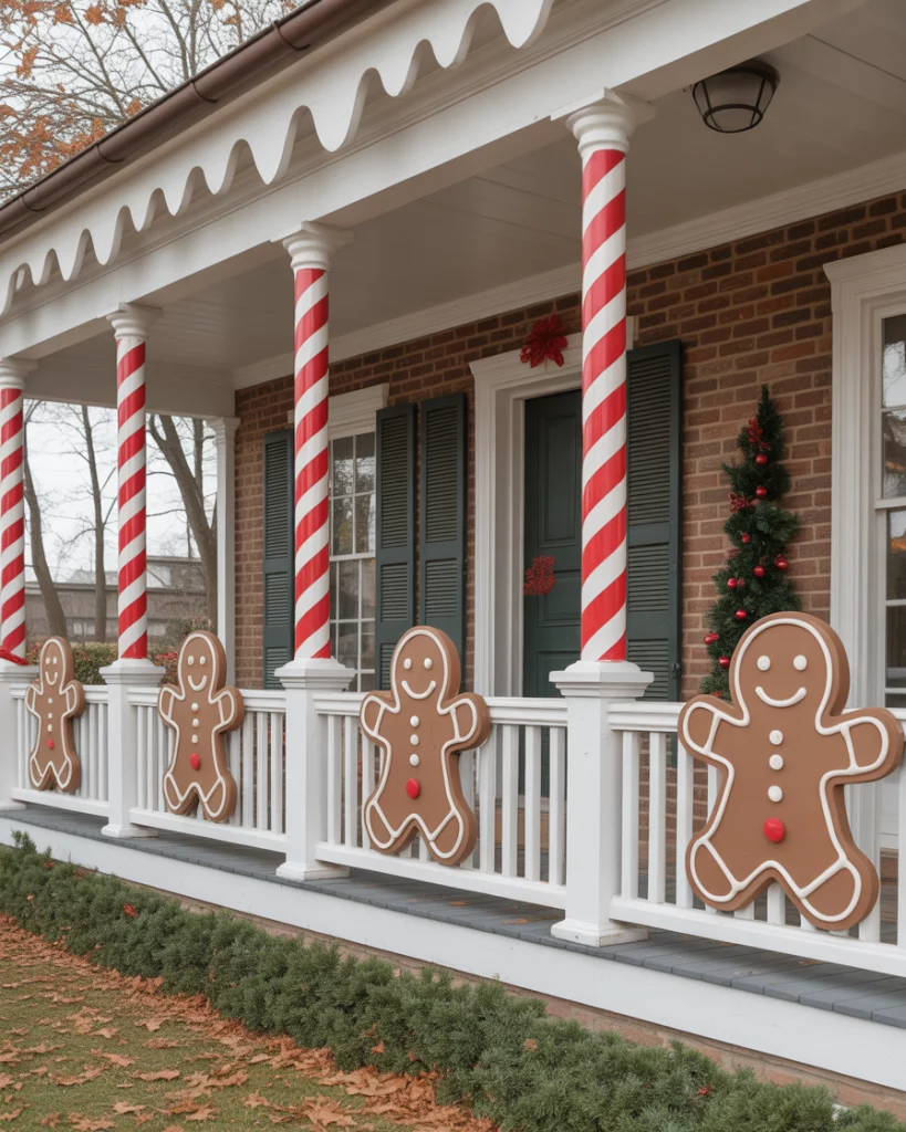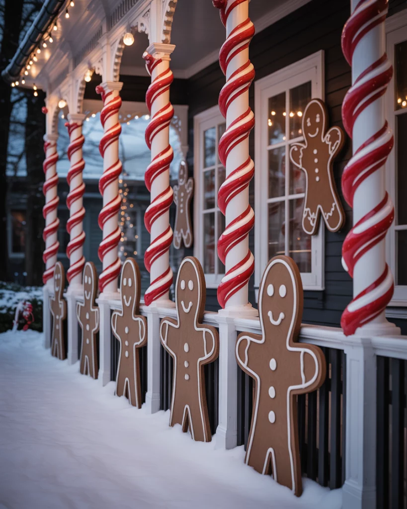 Elevate your outdoor holiday decor by turning your porch columns into giant gingerbread treats. Wrap them in brown craft paper to mimic cookie texture, then spiral wrap them with red and white ribbon to resemble oversized peppermint sticks. Add faux icing drips made from foam or fabric at the top, and place cardboard cookie cutouts along the porch rail. It’s a festive, easy setup that transforms your entryway without needing a full candy path.