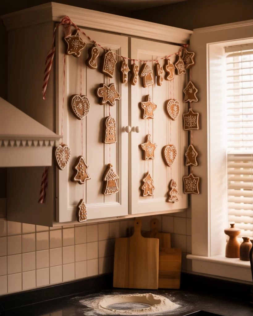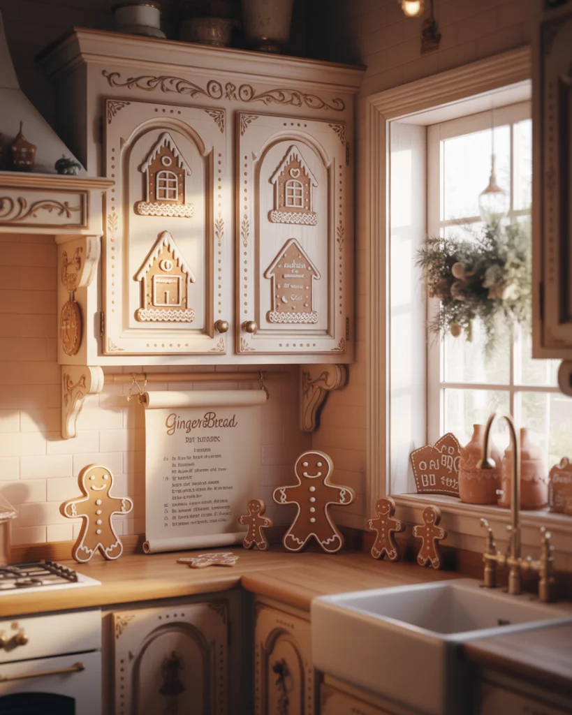 Keep your kitchen warm with wall art in the theme of gingerbread. Print cookie recipes on frames or old-fashioned baking signs and put gingerbread figurines on open shelves. Use matching ribbons or mini cookie garlands to decorate around the kitchen cabinets to create a unified appearance.