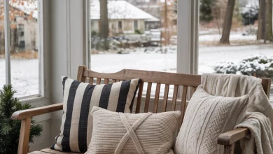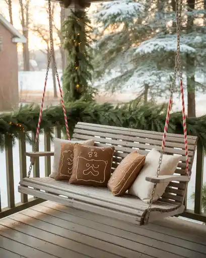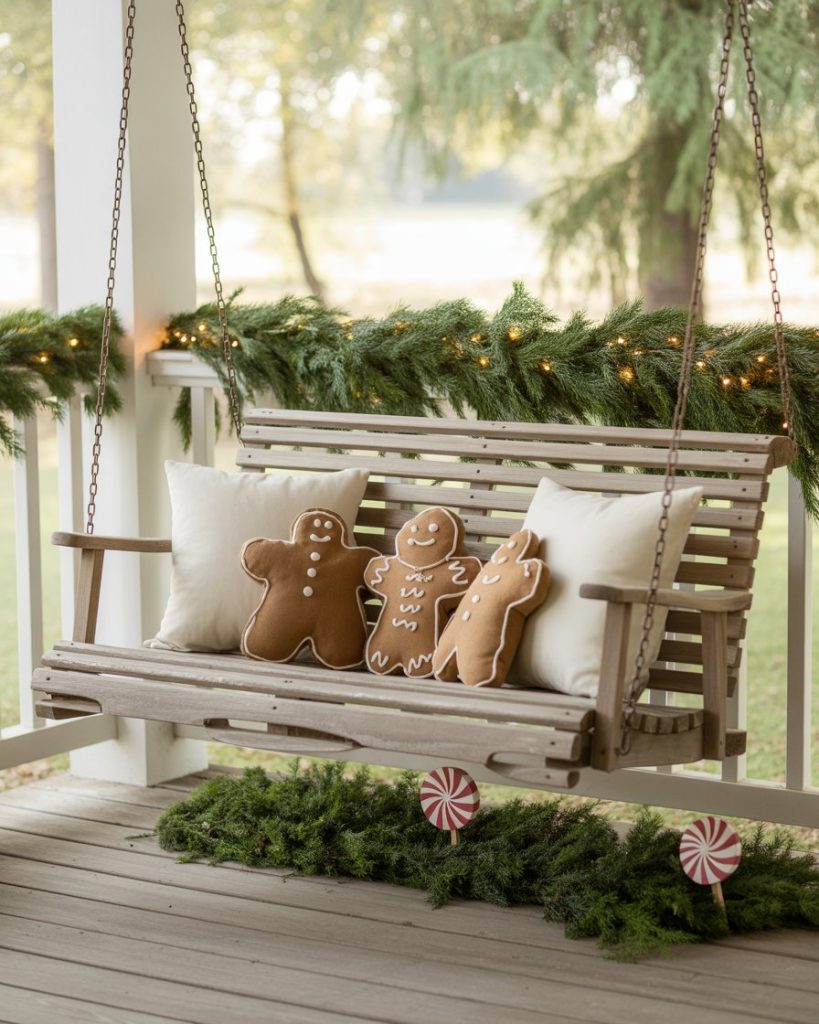 Turn a porch swing or bench into a gingerbread nook in the out-of-doors. Add cookie themed throw pillows, a plaid blanket, and cover the space with peppermint stakes or faux gumdrops. Dress the porch railing with a homemade gingerbread garland and it becomes an ideal place to take holiday photos or to drink cocoa.