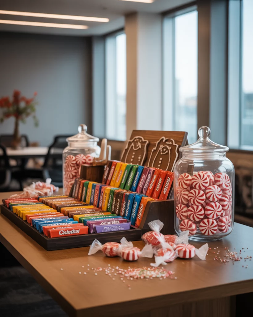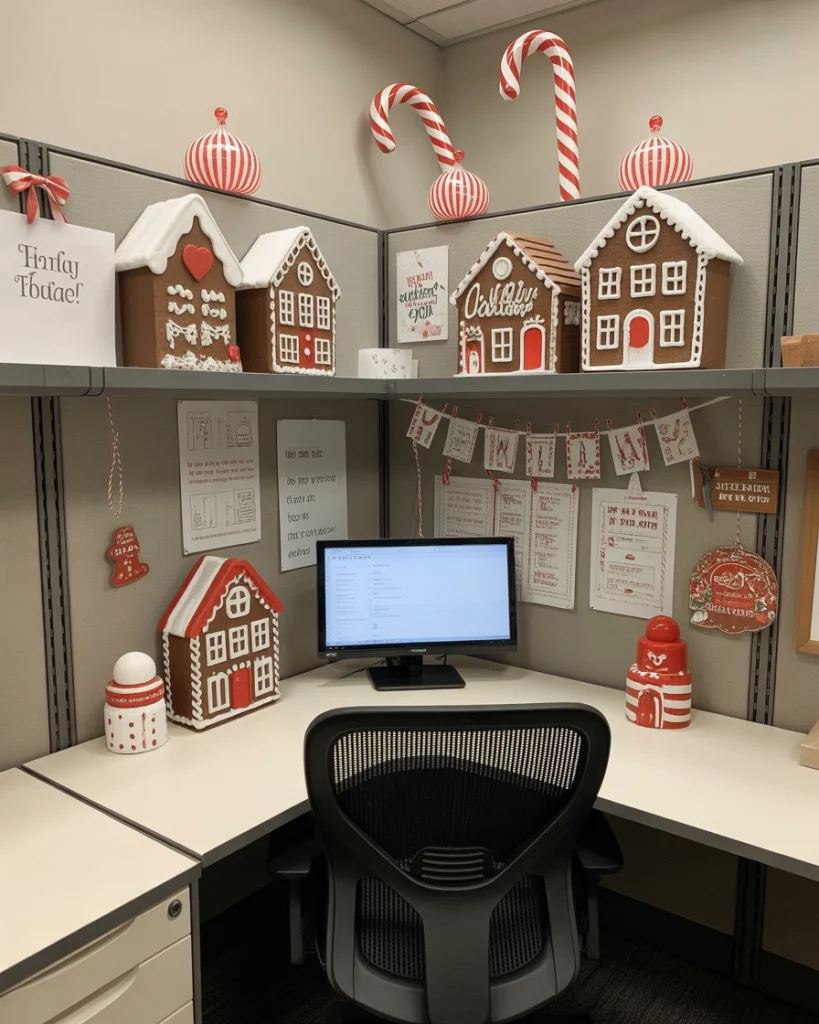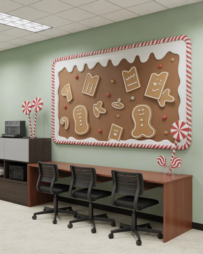 Bring the holiday magic to your office breakroom by transforming the bulletin board into a gingerbread-themed message center. Cover the board with brown craft paper to mimic a cookie base, then decorate it with cardboard candy shapes, faux icing trims, and colorful printable notes labeled “Sweet Announcements” or “Cookie Compliments.” Add mini peppermint borders and hang gingerbread people labeled with coworkers’ names for a fun personal touch. It’s a lighthearted and easy way to boost morale during the busiest season.