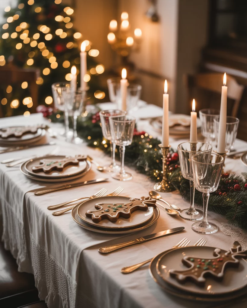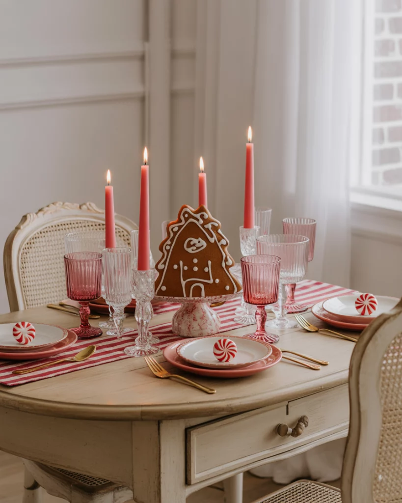Staging a retro-style centerpiece in your dining room. Prepare a tiered tray with gingerbread figures, mini houses and peppermint candles. Use lace doilies, retro-style ceramics and colored glassware in pastel colors. Insert small labels or printable name cards in the form of cookies to make it personal.