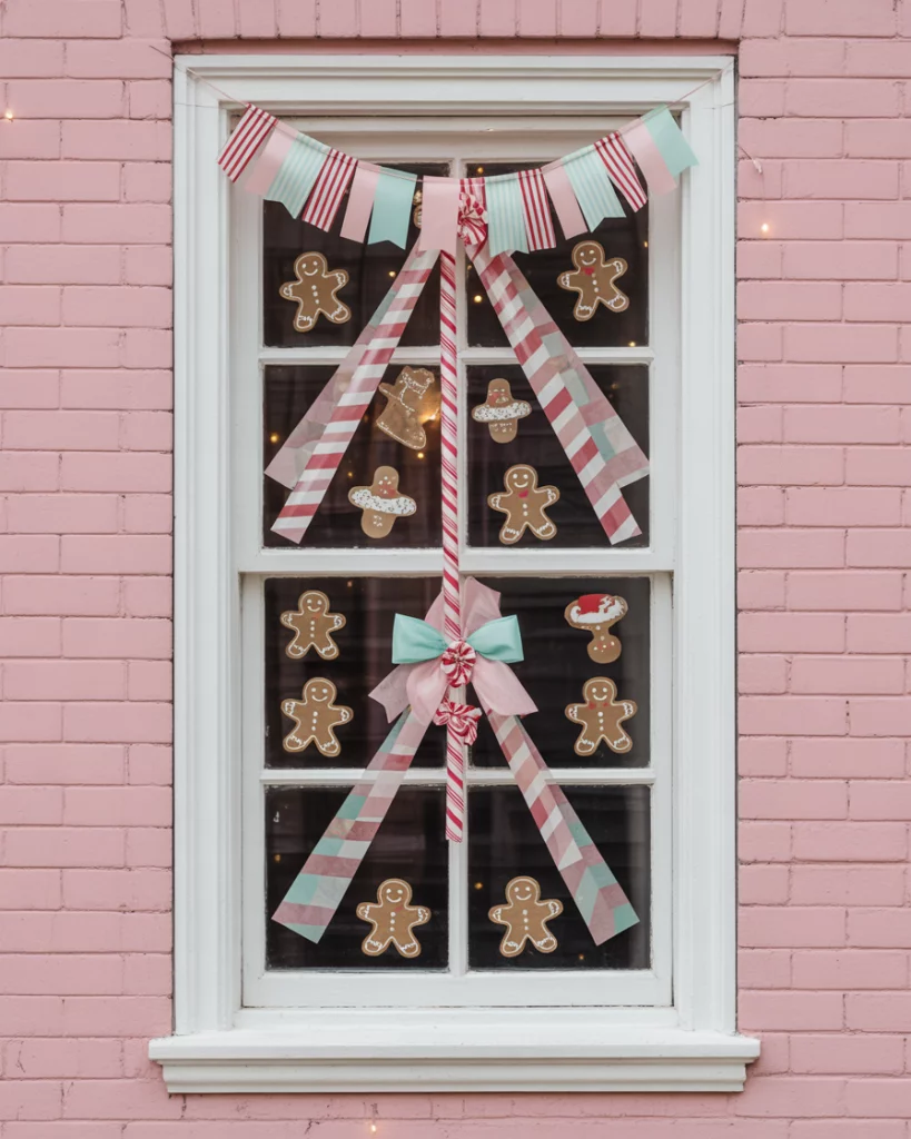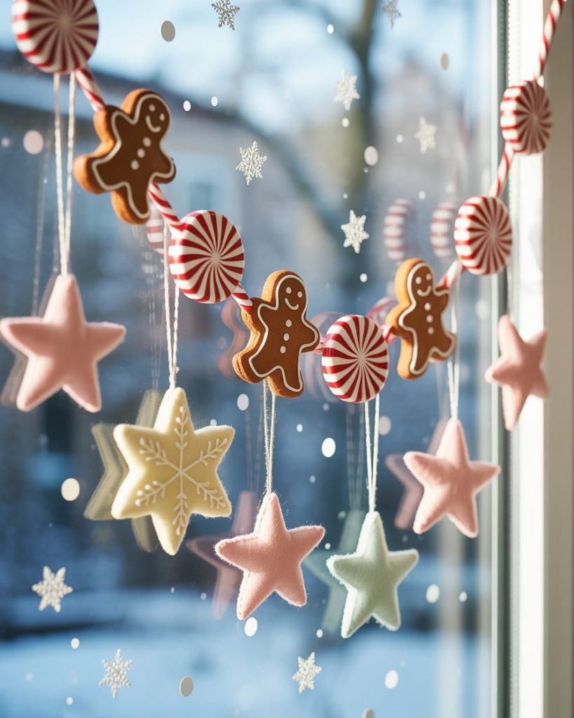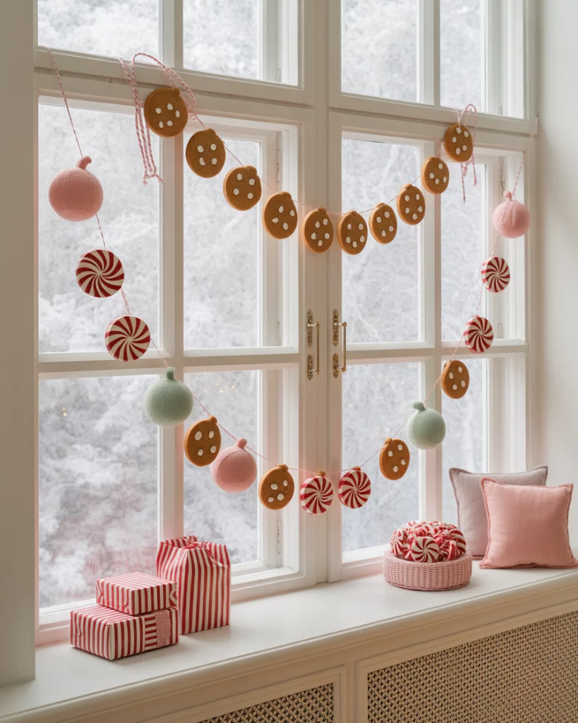 Decorate a window with a garland of gingerbread cookies, real or fake, and peppermint mini decorations. Hang pink and pastel felt ornaments to provide soft visual warmth, particularly on the shorter winter days. This decoration is best suited to kitchens or even cafe-like dining rooms.