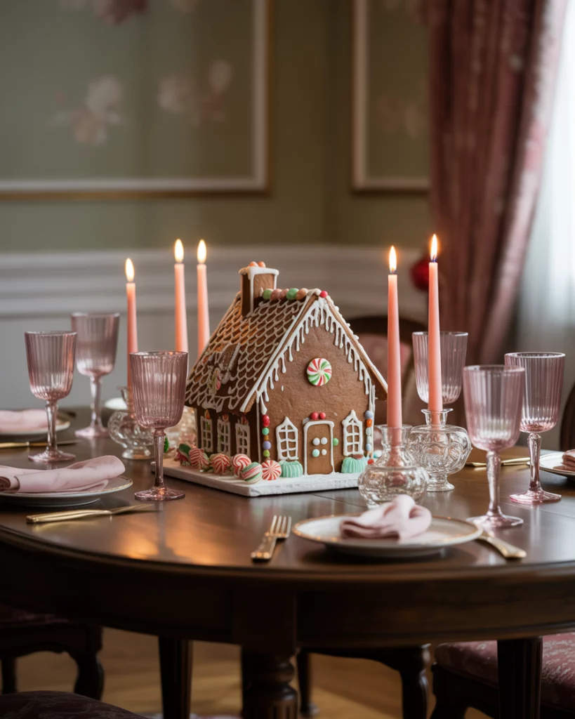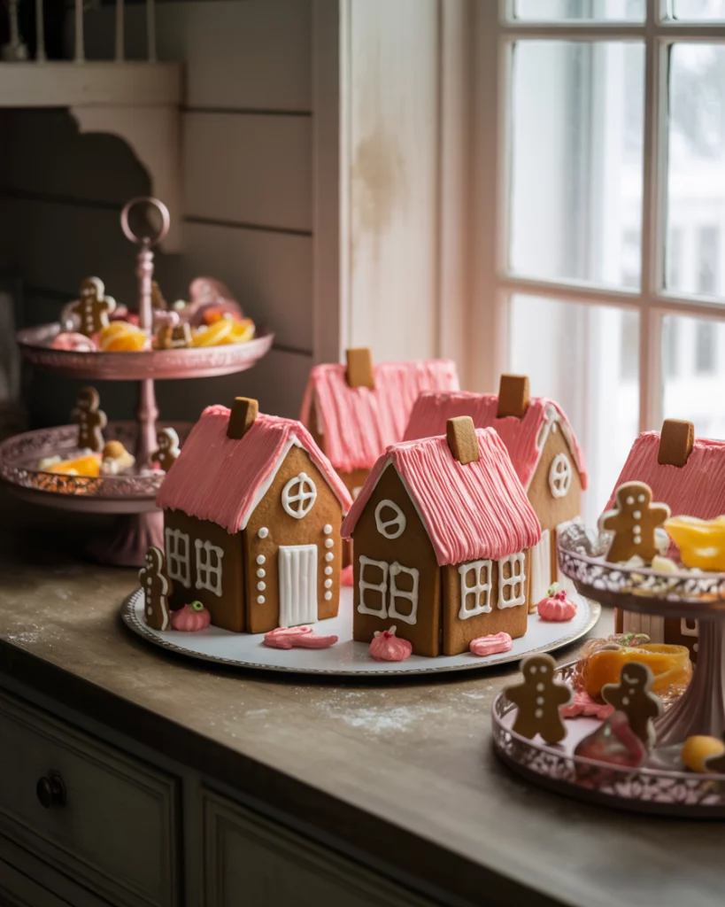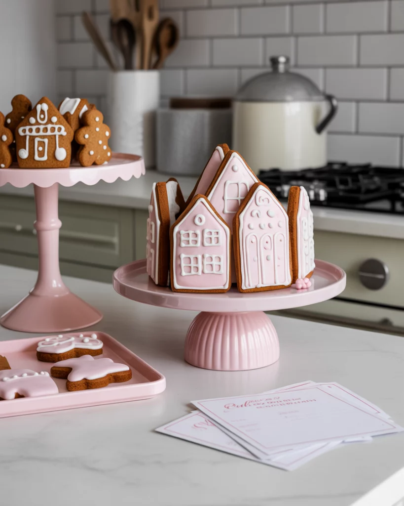 Decorate your kitchen island with a pink, pastel gingerbread stand. Imagine frosted cookie houses in pretty colors, cupcake trees, and marshmallow decorations laid out in trays or on cake stands. This arrangement transforms your kitchen into a fun holiday dream that you can invite people to have a party or bake a cake. Bonus: Include a printable recipe card of gingerbread cookies that the guests can bring home.