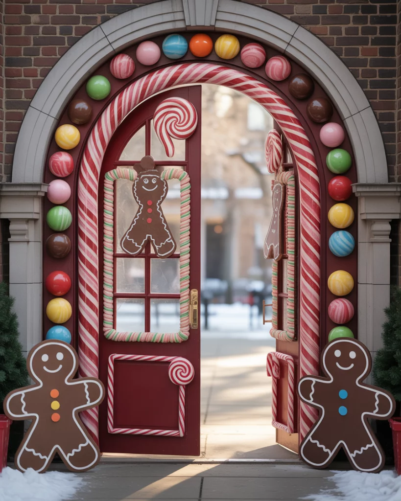Instead of just decorating a school door, turn the entire classroom entrance area into a walk-through gingerbread diorama. Use cardboard panels to build candy-shaped columns, a faux frosting arch, and cookie characters lining the hallway walls. Hang printable student artwork inside candy frames for a personal touch. This immersive setup excites kids and impresses judges during any seasonal decorating contest—it feels like stepping into a storybook.