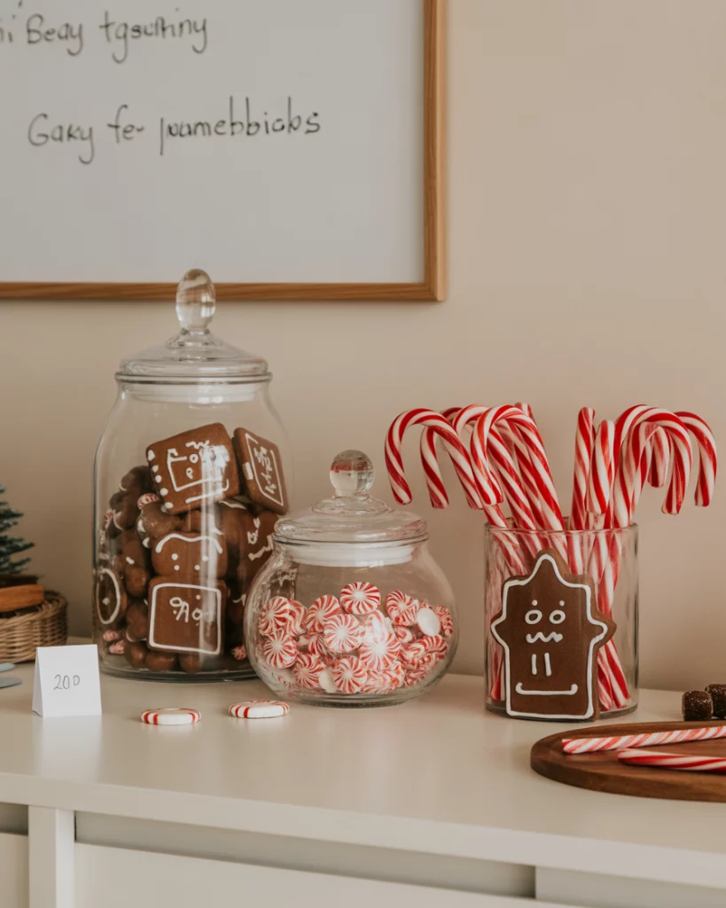 Partying? Prepare a gingerbread themed table with edible centerpieces, cookie place cards and a kitchen DIY candy station. Print labels on sweets and beverages and put gingerbread cookies in glass jars and festal ribbons. Such an appearance is ideal at informal events as well as at fancy parties.