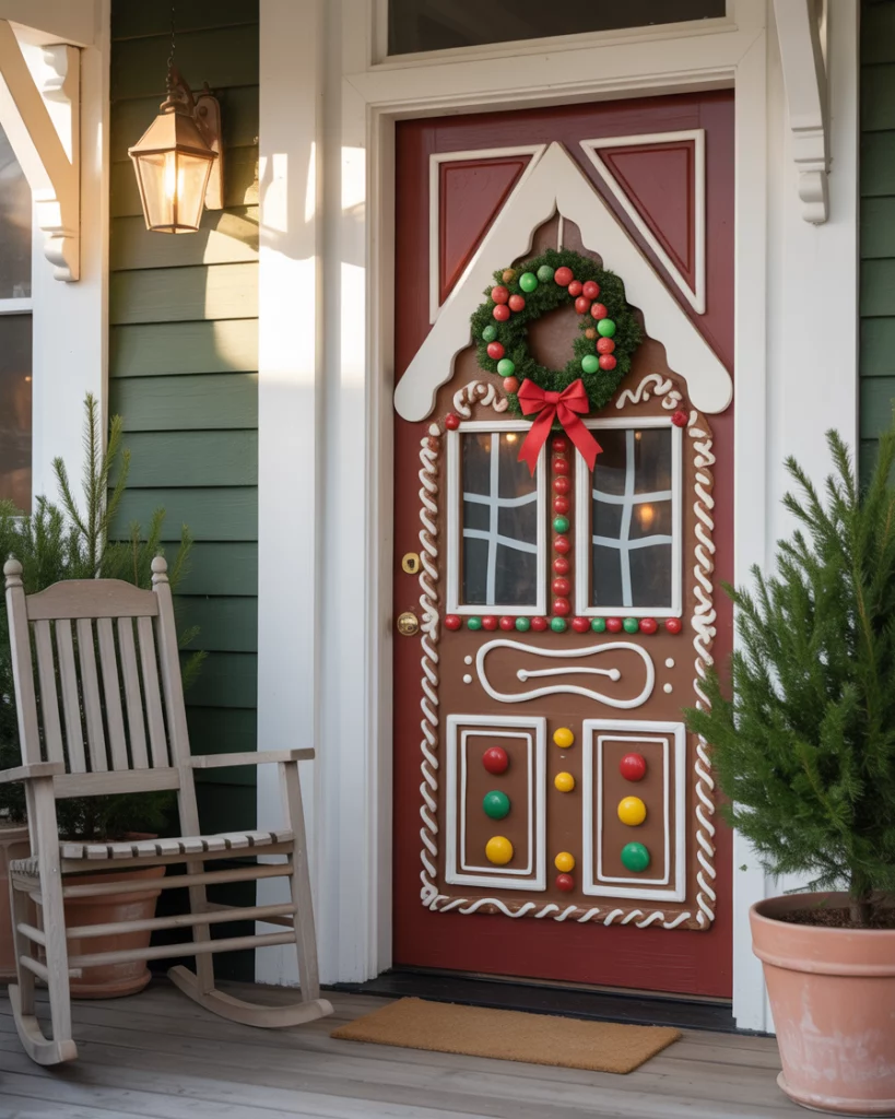 5. Gingerbread-Themed Outdoor Door Decoration.
