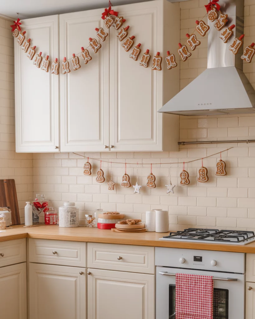 When you love a kitchen DIY, then decorating your kitchen cabinets is a win. Hang garlands of festive cookies across cabinet doors with removable hooks or hang small gingerbread ornaments. Combine mini wreaths or red bows. This appearance is festive without being space-consuming, which suits people who appreciate modest but jovial decorations.