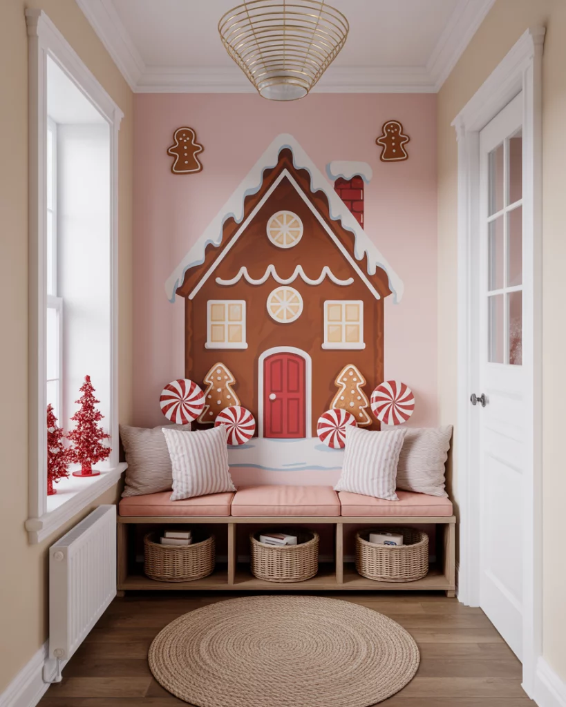 Transform a blank hallway wall into a whimsical gingerbread mural using removable wallpaper, printables, or hand-painted cardboard cutouts. Create the scene of a snowy gingerbread house complete with candy cane fences, icing-lined rooftops, and peppermint trees. Add a cozy bench with pastel cushions below for a charming reading nook or a festive photo spot. This idea works beautifully in both homes and classrooms, bringing instant holiday magic to an often-overlooked space.