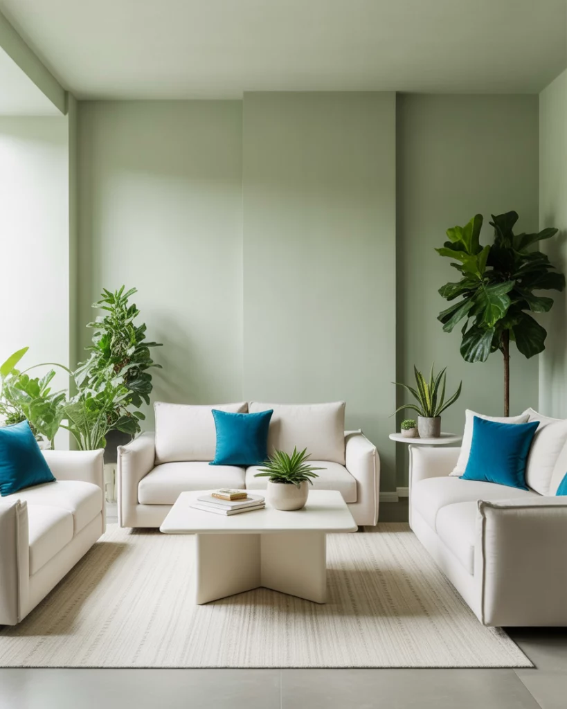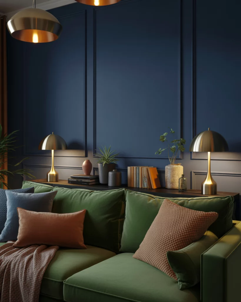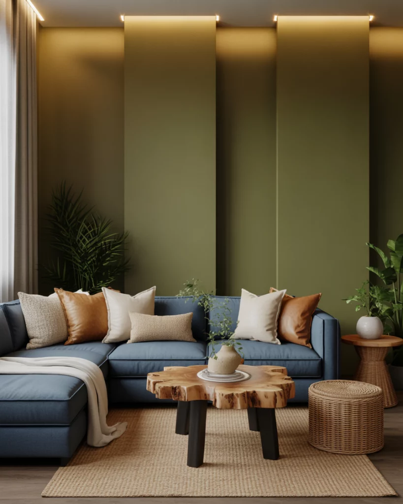 Pair blue and olive tones for a calm, ocean-meets-forest vibe. Try olive walls and navy throws, or the opposite—a deep-blue sofa against a muted green backdrop. The color scheme feels balanced, elegant, and effortless. Ideal for those who appreciate subtlety and natural connection in their home’s designs.