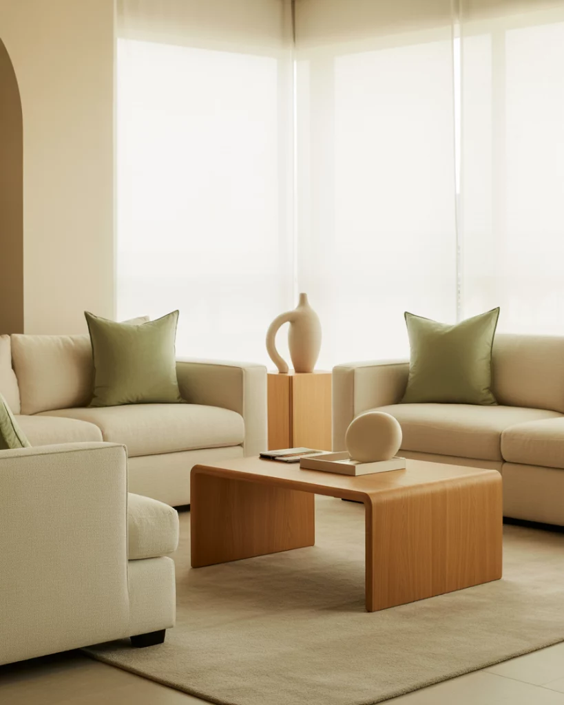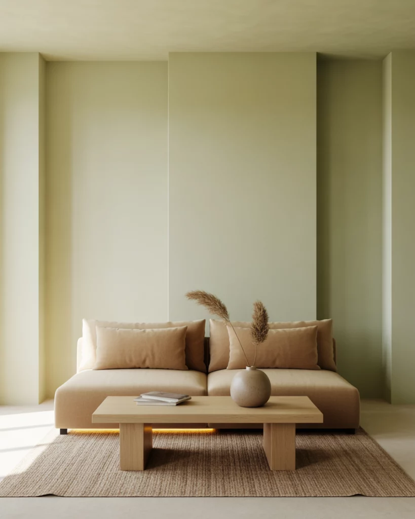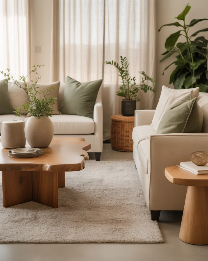 For an organic, peaceful home, use neutral and earthy tones alongside light sage or moss green accents. A beige rug, natural linen curtains, and wooden details make it serene and timeless. Add plants to emphasize the connection between nature and interior calm—a direction predicted for future eco-aesthetic interiors.