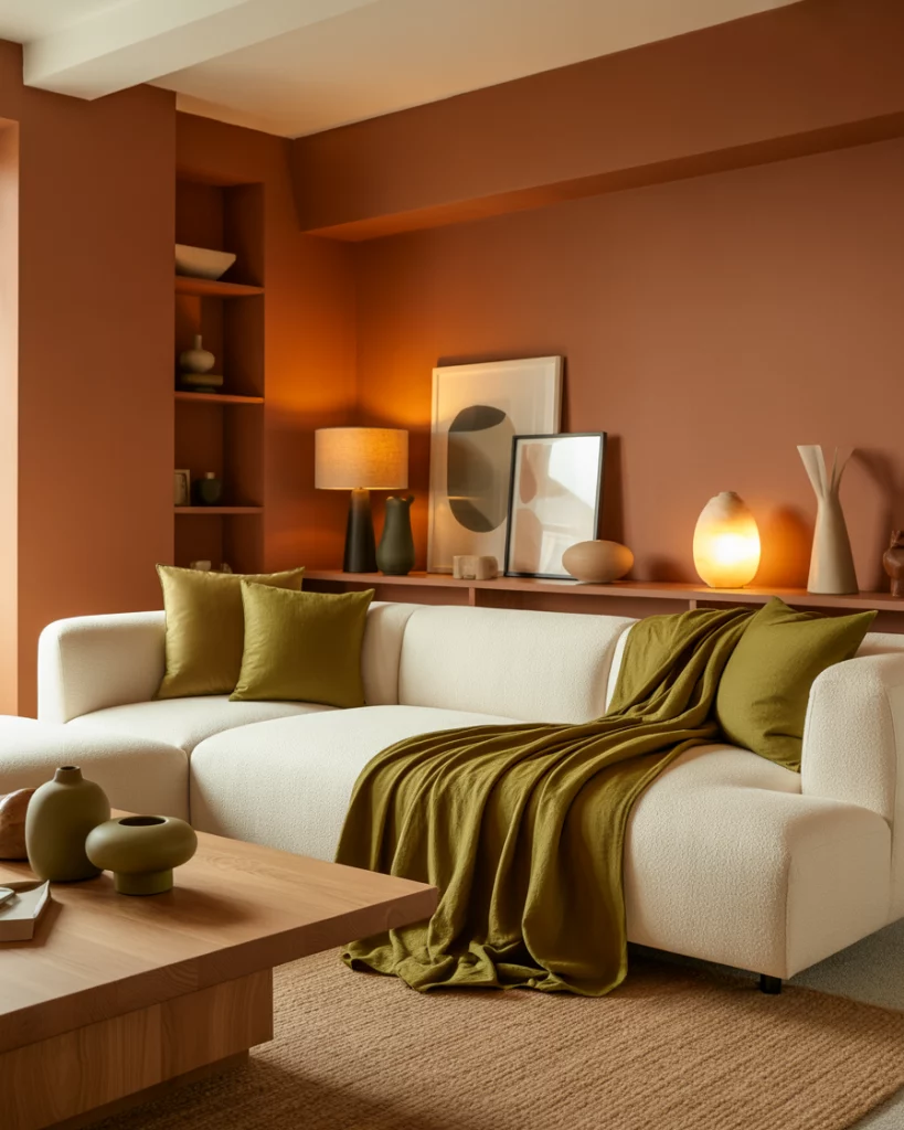 If your preference is the warm side of green living, pair olive green elements (like an accent wall or couch) with terracotta and rust-colored accessories—pillows, ceramic decor, and a terracotta-tone rug. The rustic charm emerges through textured surfaces like exposed brick, wood beams, or vintage furniture. This combination feels lived-in, tactile, and very much aligned with 2026’s move toward warmer, nature-inspired interiors.