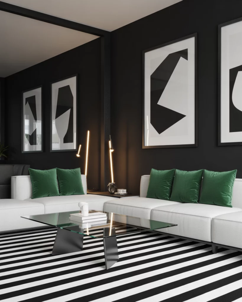 A crisp, modern black and white and green combination makes a striking visual statement. Paint the walls white, add a dark sofa, and layer in emerald cushions and green rug patterns. It’s both bold and refined—a favorite of minimalist designers who love structure but want warmth through natural tones.