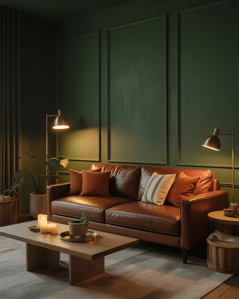 Here’s for the bold: combine brown and burnt orange furniture or accents with plenty of earthy green touches. A rich brown leather sofa, a burnt orange armchair, a deep green rug, and green-painted walls or an accent panel bring a warm, layered feel. This type of earthy palette is very much in vogue for 2026, with rust and terracotta also mentioned frequently.