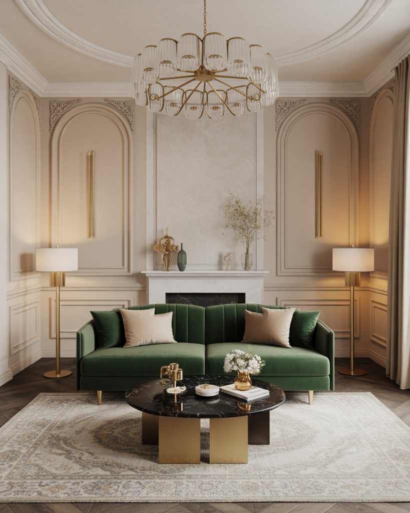 A rich look is one that incorporates emeralds with gray. Add gold accents to provide glamour. This look provides luxury in high style. This velvet couch, adorned with high-style gold accents, gives your room a rich and luxurious appearance. It is a place of gold and glitz—a 2026 interiors look to simply add glamour.