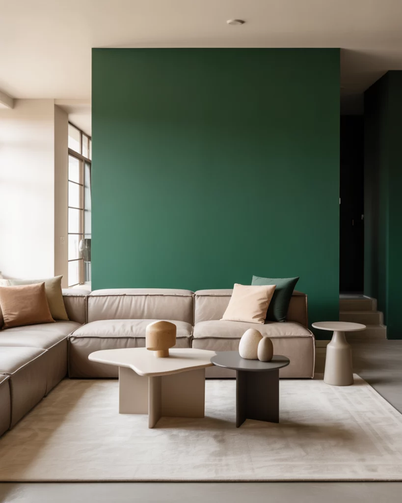 6. Emerald Green Statement Wall with Neutral Furniture