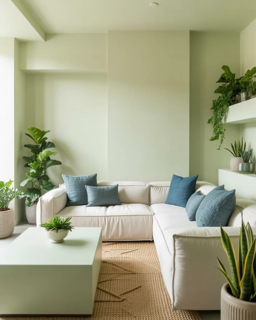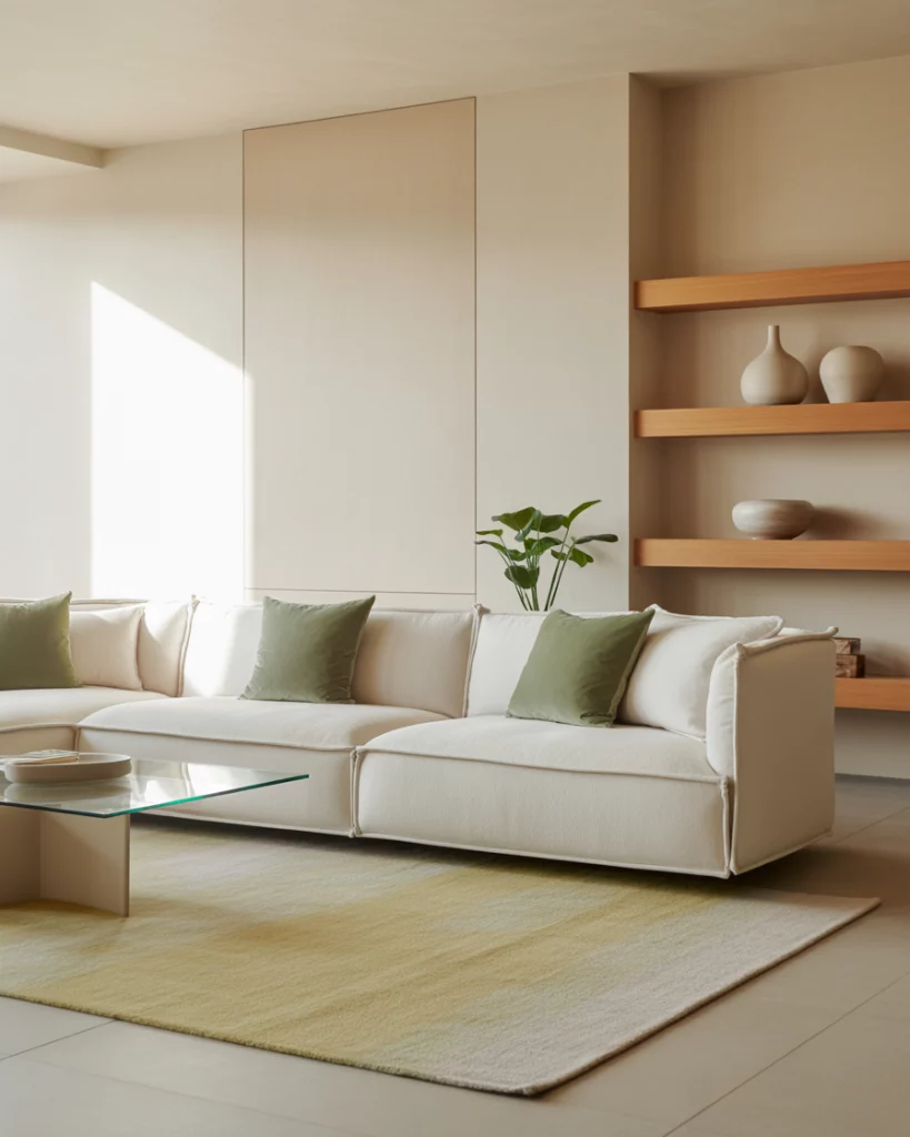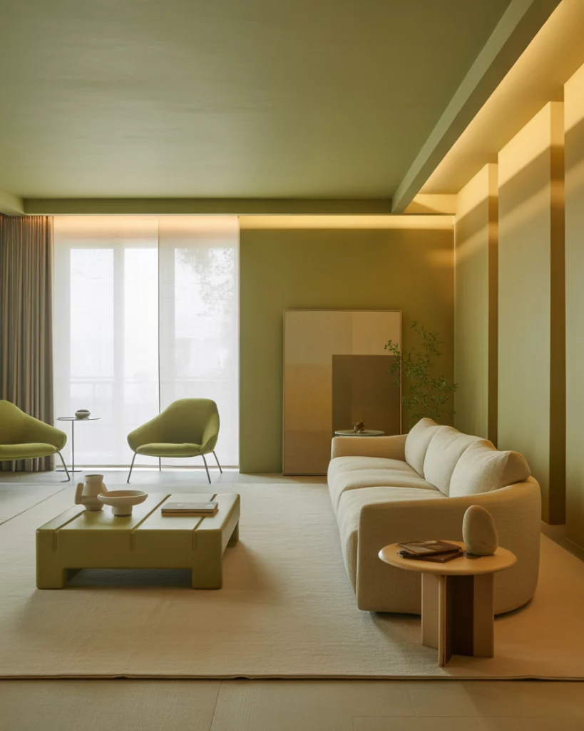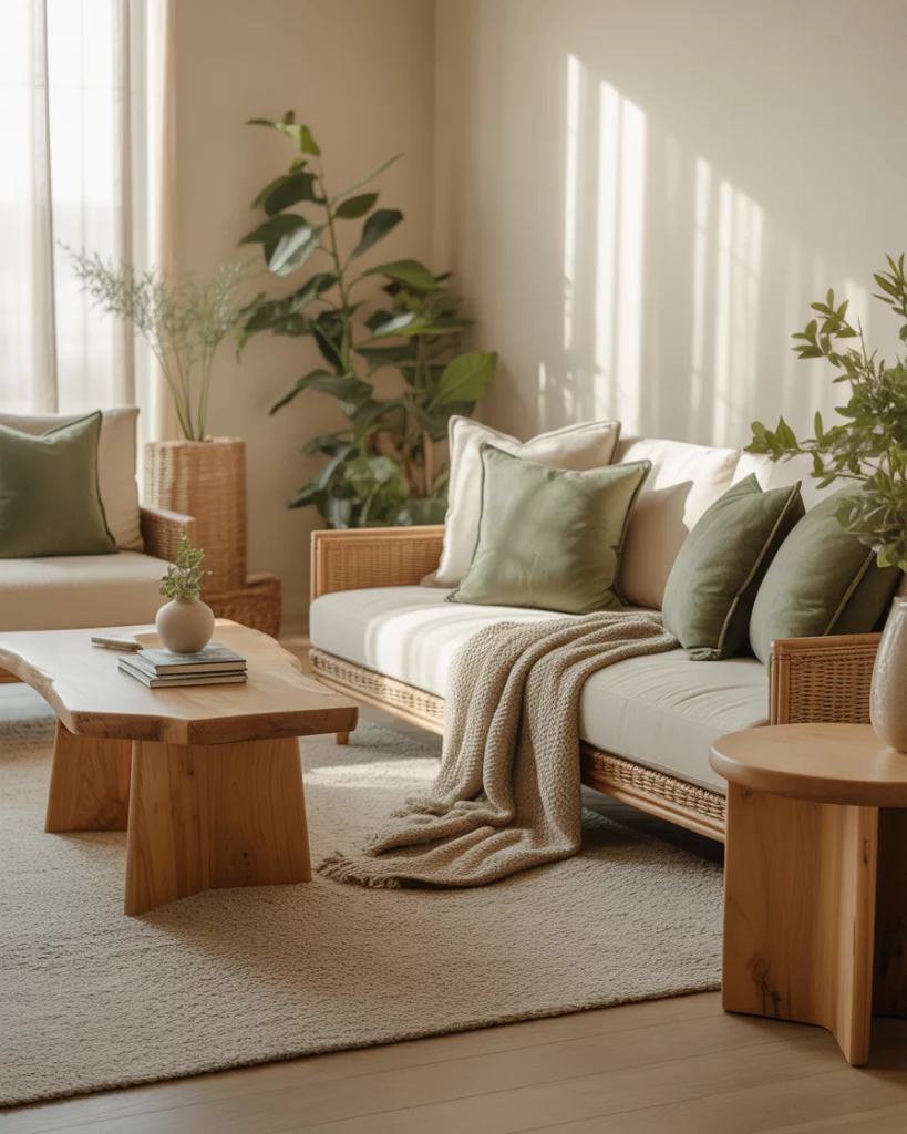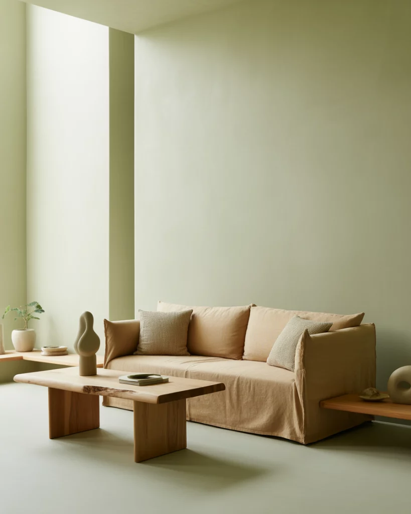 For an organic, peaceful home, use neutral and earthy tones alongside light sage or moss green accents. A beige rug, natural linen curtains, and wooden details make it serene and timeless. Add plants to emphasize the connection between nature and interior calm—a direction predicted for future eco-aesthetic interiors.