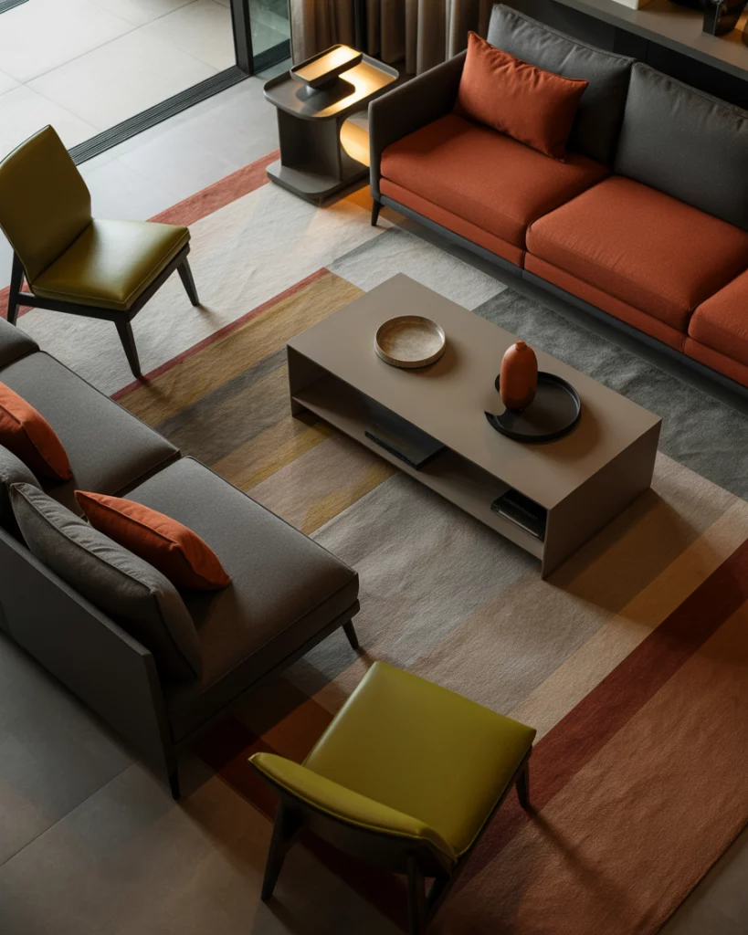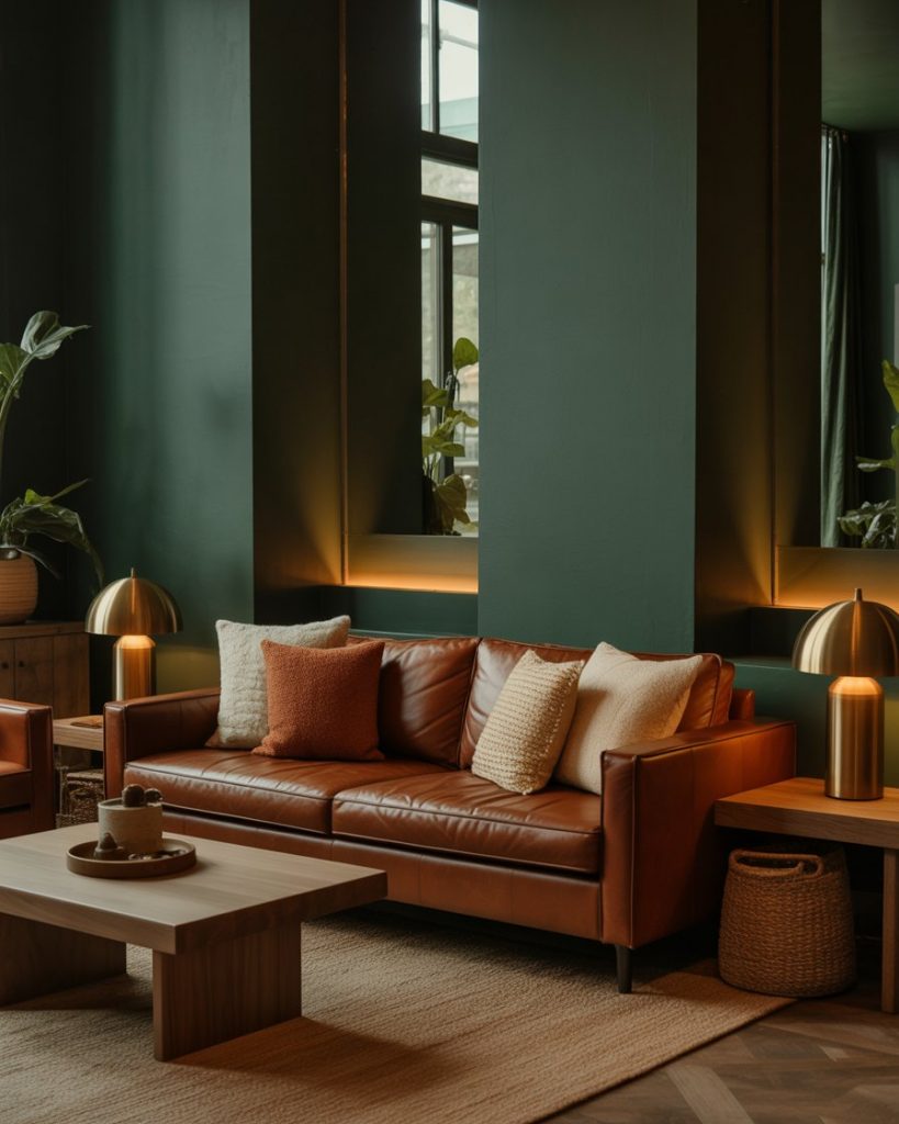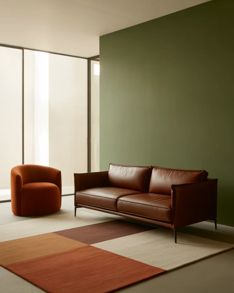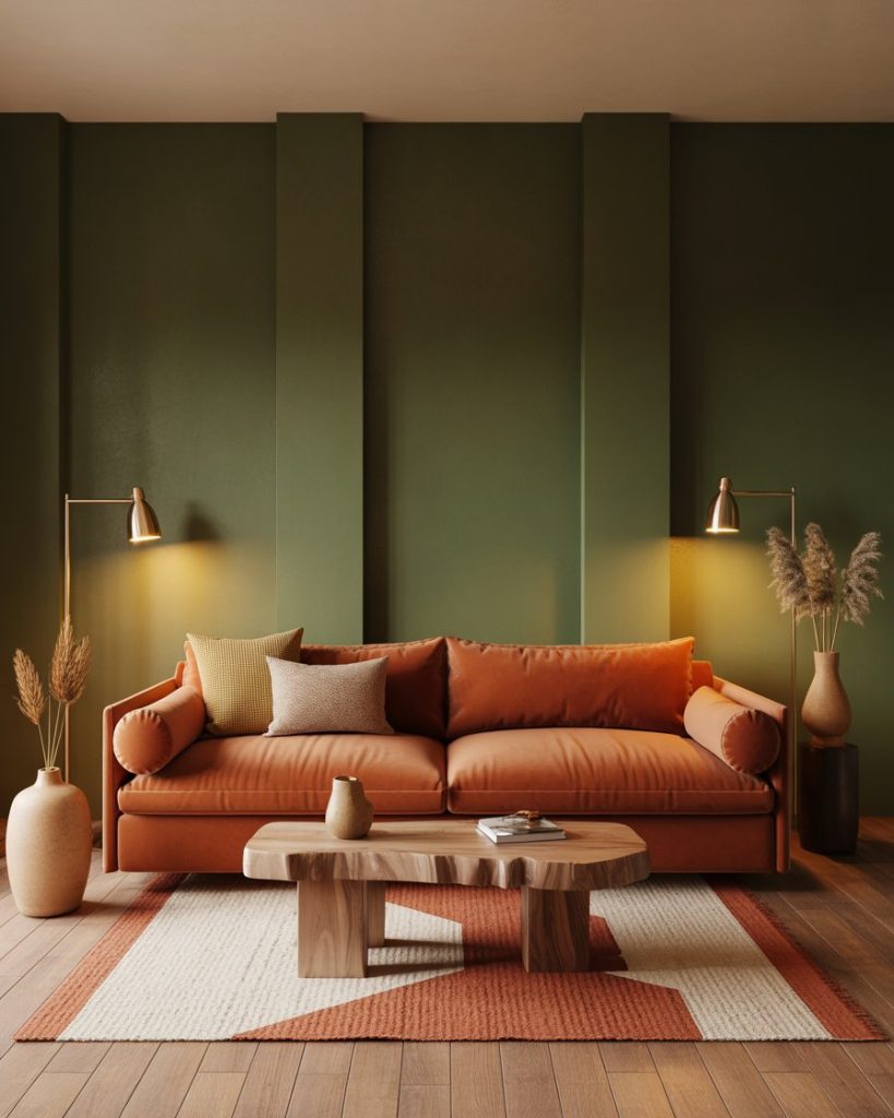 Here’s for the bold: combine brown and burnt orange furniture or accents with plenty of earthy green touches. A rich brown leather sofa, a burnt orange armchair, a deep green rug, and green-painted walls or an accent panel bring a warm, layered feel. This type of earthy palette is very much in vogue for 2026, with rust and terracotta also mentioned frequently.