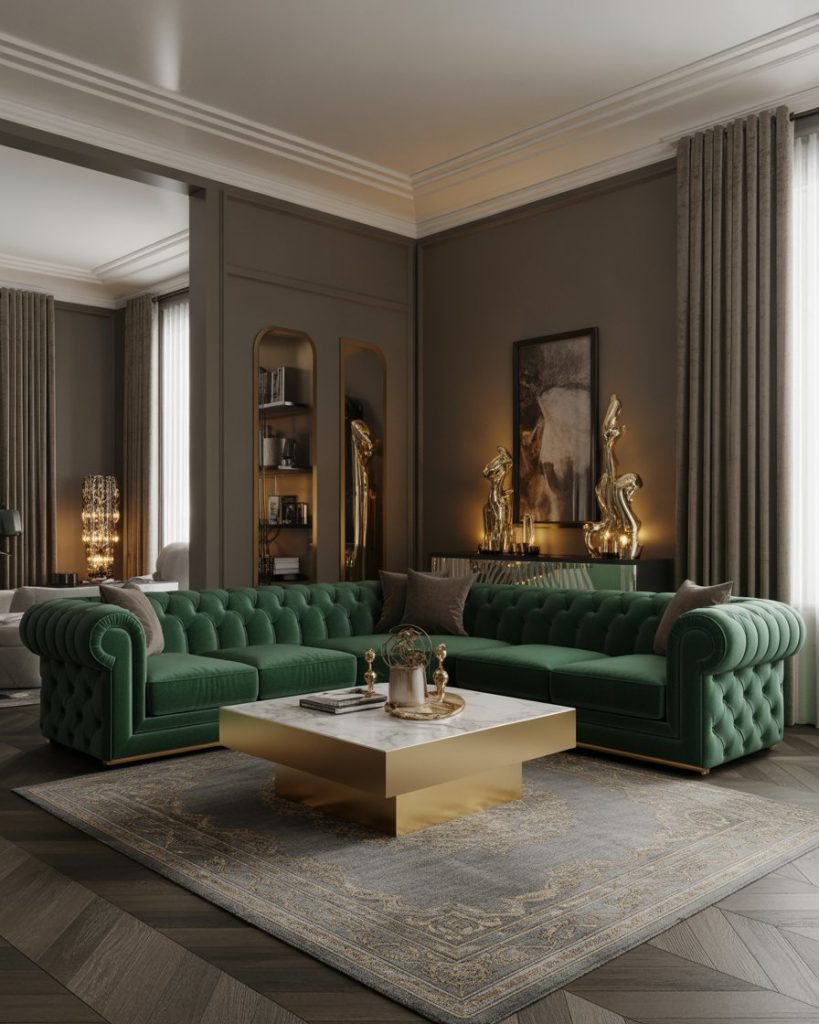 A rich look is one that incorporates emeralds with gray. Add gold accents to provide glamour. This look provides luxury in high style. This velvet couch, adorned with high-style gold accents, gives your room a rich and luxurious appearance. It is a place of gold and glitz—a 2026 interiors look to simply add glamour.