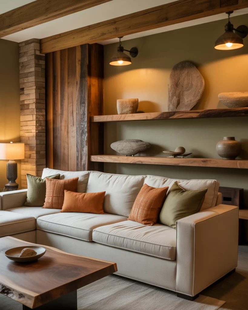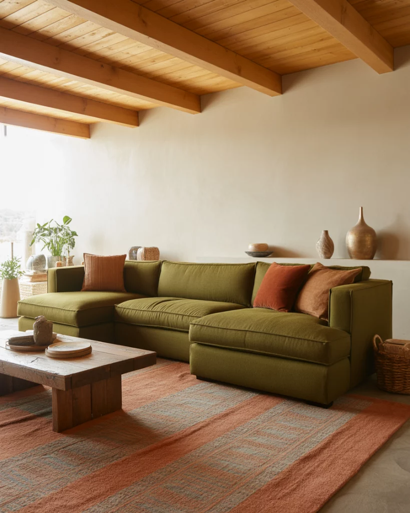 Mixing the shades of gray and rust with warm green creates a welcoming and artistic atmosphere. A sectional couch with rust-colored seats, olive accent walls with paint, and a comfortable rug ensure a layered and interesting look. This modern take on nature-inspired homes achieves harmony between serenity and personality—a perfect blend for 2026’s creative souls.