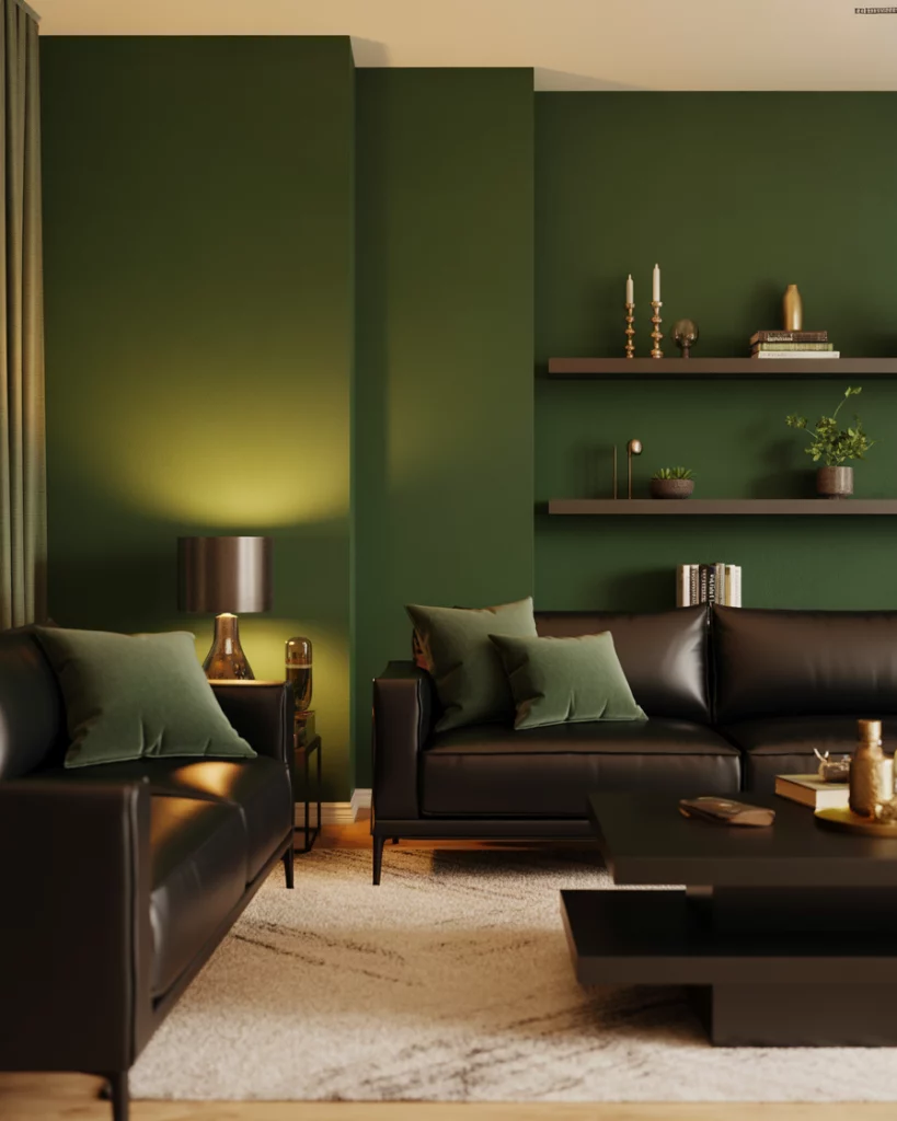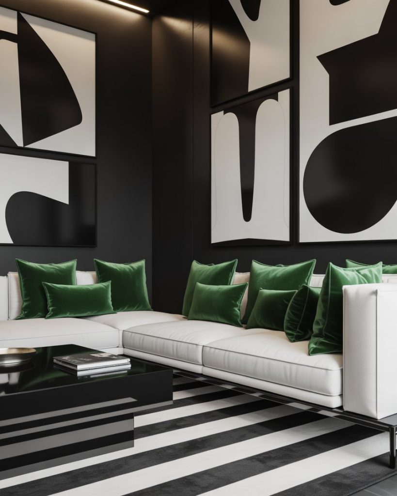 A crisp, modern black and white and green combination makes a striking visual statement. Paint the walls white, add a dark sofa, and layer in emerald cushions and green rug patterns. It’s both bold and refined—a favorite of minimalist designers who love structure but want warmth through natural tones.