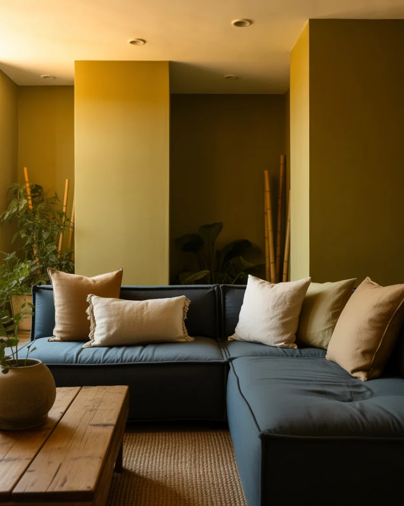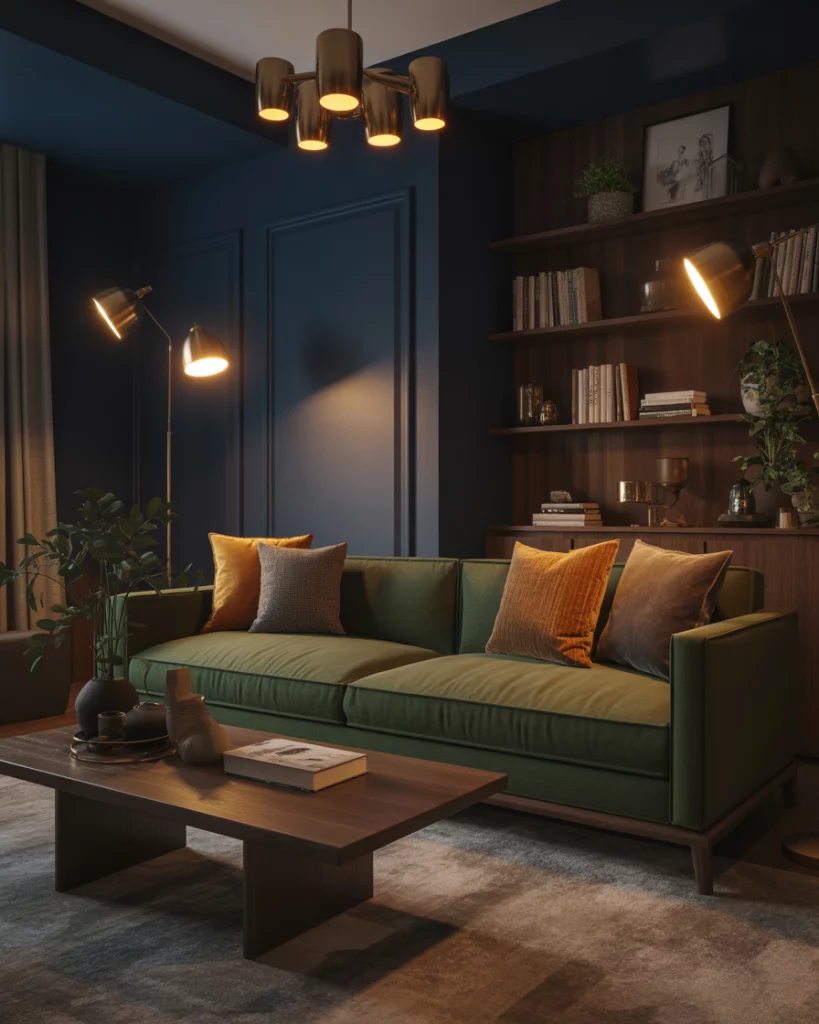 Pair blue and olive tones for a calm, ocean-meets-forest vibe. Try olive walls and navy throws, or the opposite—a deep-blue sofa against a muted green backdrop. The color scheme feels balanced, elegant, and effortless. Ideal for those who appreciate subtlety and natural connection in their home’s designs.