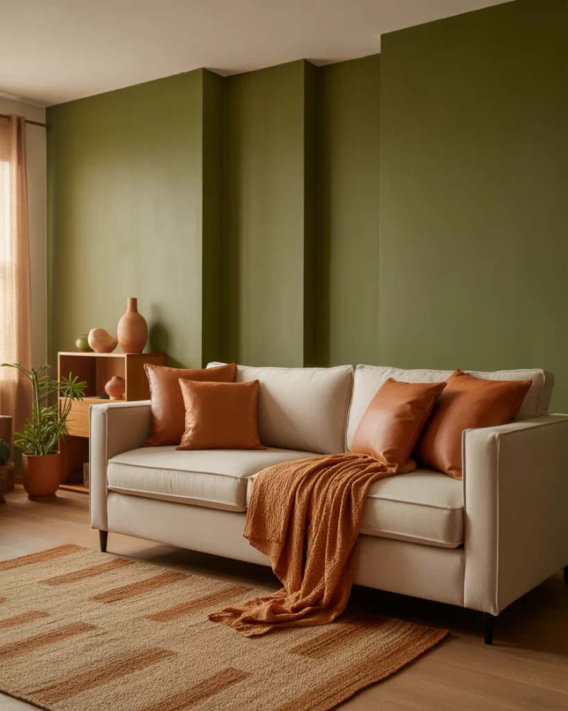 If your preference is the warm side of green living, pair olive green elements (like an accent wall or couch) with terracotta and rust-colored accessories—pillows, ceramic decor, and a terracotta-tone rug. The rustic charm emerges through textured surfaces like exposed brick, wood beams, or vintage furniture. This combination feels lived-in, tactile, and very much aligned with 2026’s move toward warmer, nature-inspired interiors.