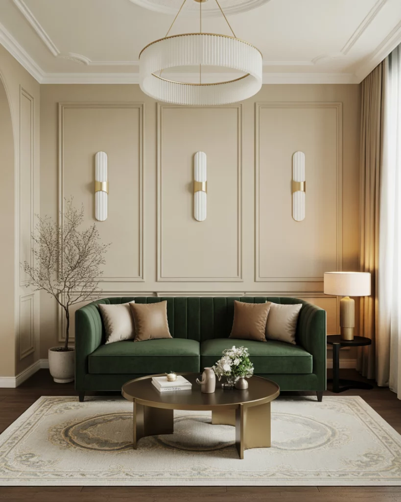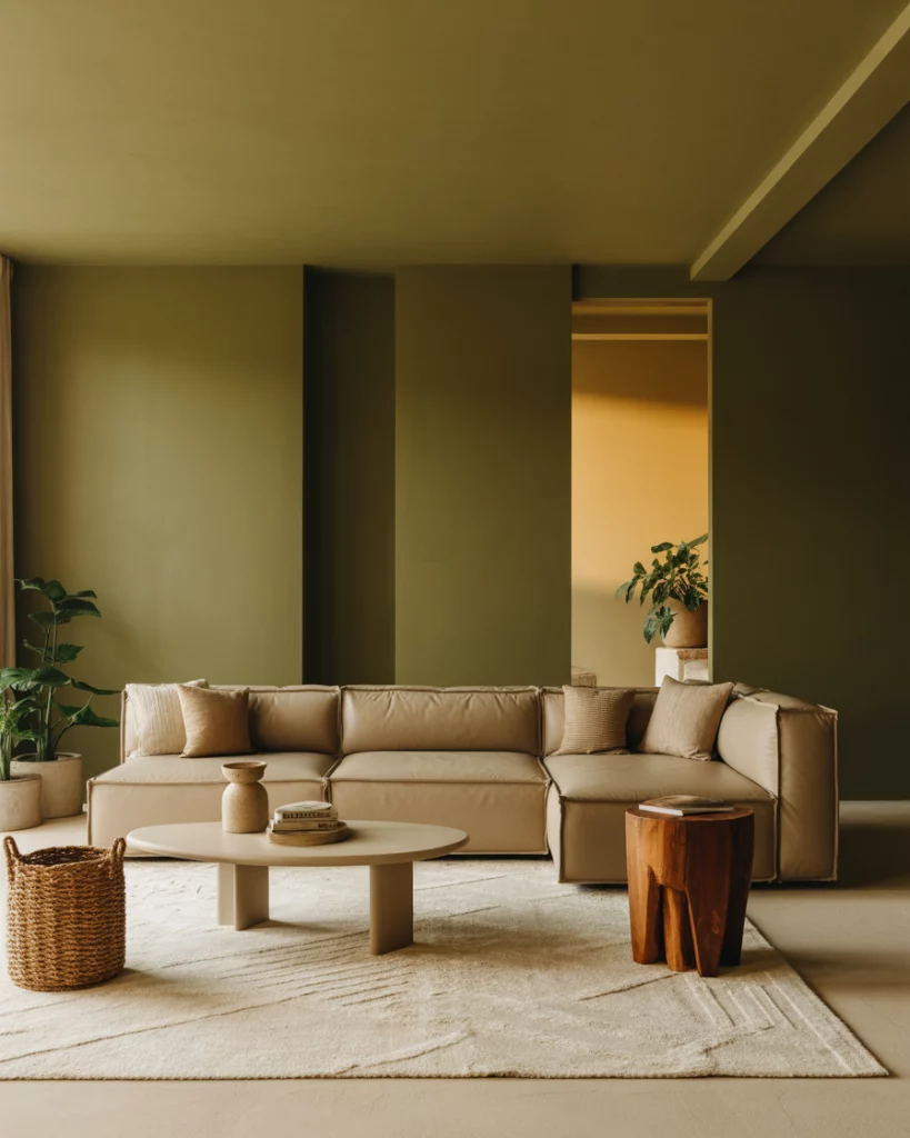 Here the idea is to anchor the room in olive green—perhaps a generous sectional or accent wall—then soften the look with beige and cream furnishings and textiles. The combination creates a balanced aesthetic: the green gives depth and freshness, while beige and cream keep things light and approachable. Designers report a growing preference for these warmer, nature-inspired hues.