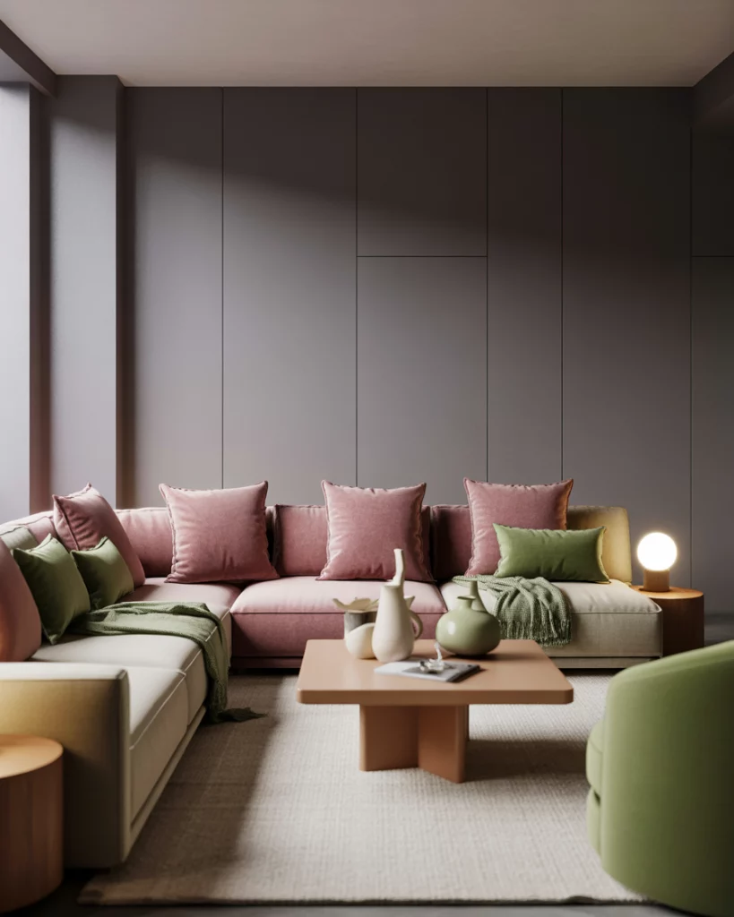 If you’re drawn to a lighter palette but still want green vibes, try a base of grey and subtle pink and a few hints of sage green in accents. For example, you could use grey for the walls and sofa, blush-pink for the cushions or artwork, and sage green for the throws or rug. It’s modern, soft, and layered, appealing for those who like calm tones but also want personality. The “new neutrals” trend supports soft greens and pale pinks as alternatives.