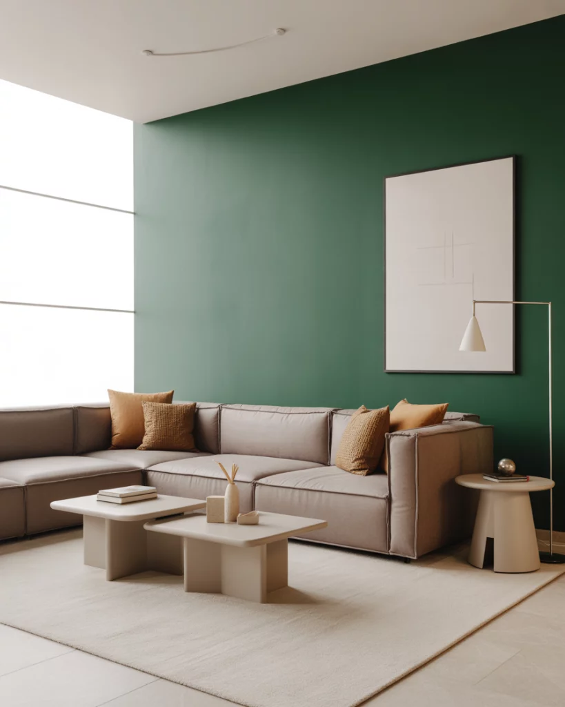 6. Emerald Green Statement Wall with Neutral Furniture