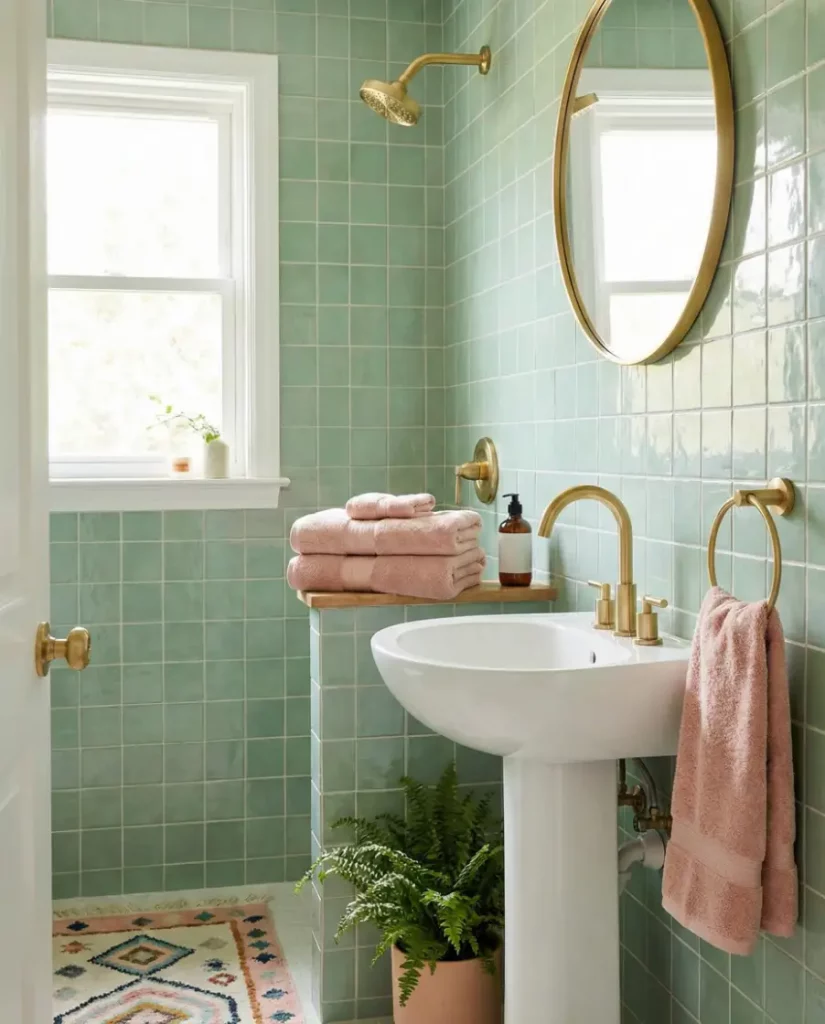20. Soft Green Tile Decor for Everyday Bathrooms
