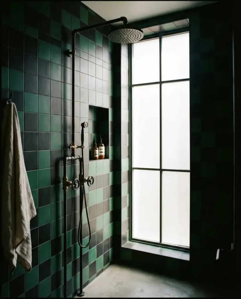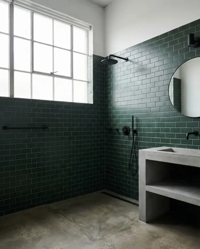 Pairing Black and green tile delivers a confident, urban feel. Often seen in city apartments, this palette works well with concrete floors and industrial details. The contrast sharpens the space while letting green soften the overall mood.