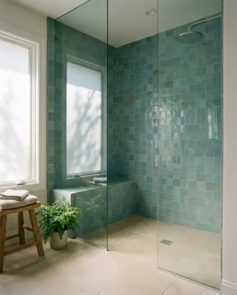 Blue-leaning green tile brings a relaxed coastal feeling without feeling themed. These Blue and green blends work beautifully in bathrooms that rely on natural light and simple wall layouts. Often seen in shower surrounds or half walls, this shade softens the space while still offering visual interest.