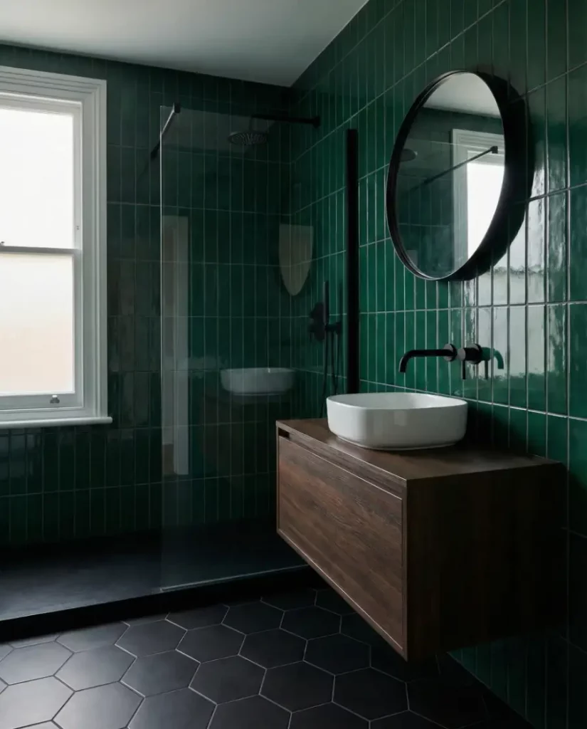 Pairing saturated green tile with a Black floor creates a bathroom that feels grounded, confident, and unmistakably modern. This approach emphasizes contrast, allowing the green wall surfaces to stand out while the darker floor visually anchors the room. In contemporary design schemes, this combination feels intentional rather than dramatic, especially in streamlined layouts.