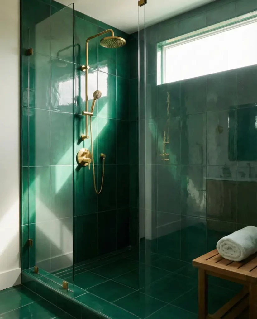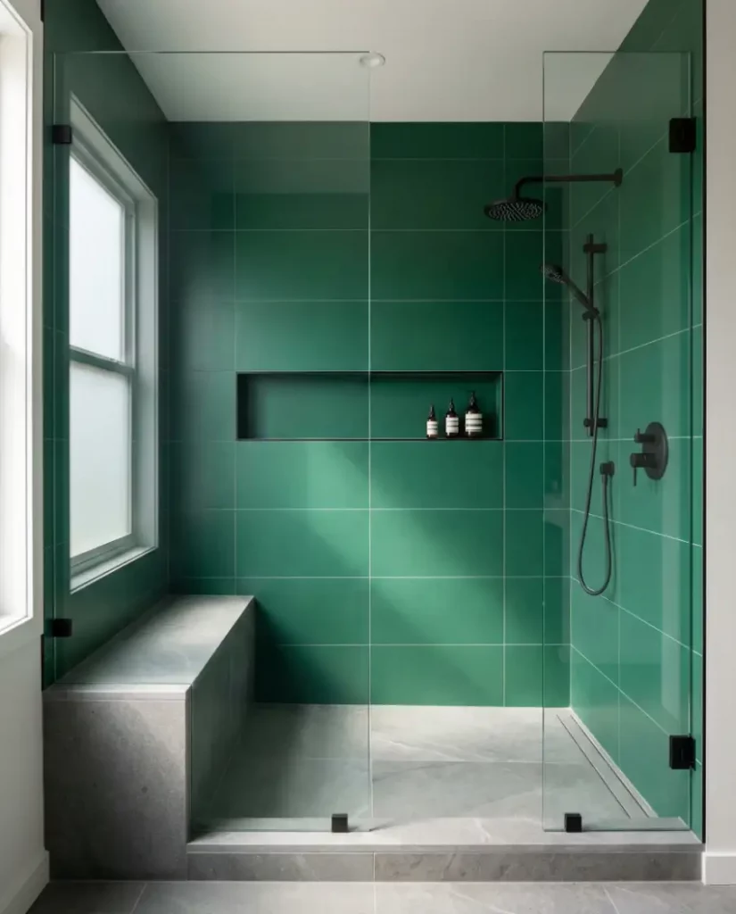 Emerald green tile turns everyday showers into design moments. These jewel-toned shower designs often feature glossy finishes that catch light beautifully, especially when paired with Large format tile. The richness of Emerald works best when allowed to dominate one main surface rather than scattered accents.