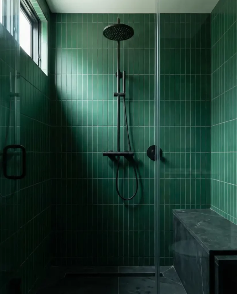 Deep, saturated green tile is redefining what a grown-up bathroom can feel like. In these green tile bathrooms, darker shades paired with Black and metal accents create a cocoon-like atmosphere that feels intentional, not gloomy. This look often appears in full wall applications or wrapped around a walk-in shower, giving the space depth and a sense of architectural weight.